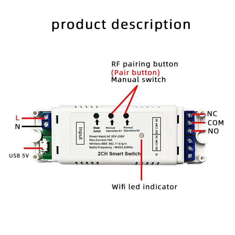 Cutover currenent≤ 10AВход USB 5 В (тип 2,4,5,6,7,8)Входное напряжение винтовой Клеммы:DC/AC7-32V (тип 1,3,5,6)AC85-250V (тип 2,4,7,8)Выход: Пассивный выход (сухой контактный выключатель)Рабочая температура: от-20 до 70 градусов ЦельсияРабочая влажность: от 40% до 80% относительной влажностиСтандарт WI-FI: 2,4 ГГц, IEEE802.11 b/g/n (не поддерживает 5G)Размер: 120*38*25 ммПриложение: eWeLinkАккумулятор RF433 пульта дистанционного управления: 27A 12 вольт постоянного тока (в комплект не входит)