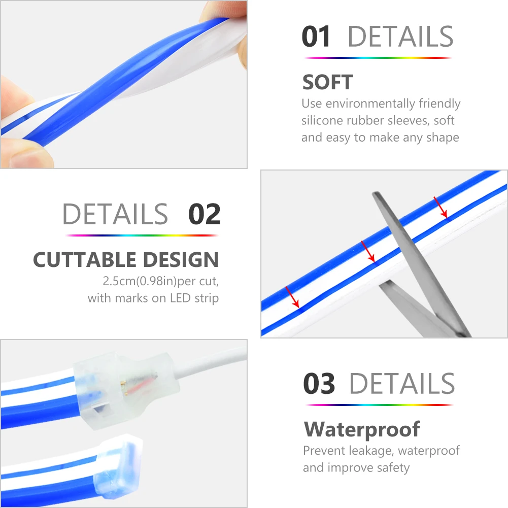 Можно резать неоновая лента, 2,5 см (0.98in) на вырезать, пожалуйста, приобретите дополнительные силиконовый клей для того чтобы вставить наших ламп в любом месте, которые вам нравятся, 360 градусов, вы можете разрезать на DIY специальное украшение для жилых помещений/Дизайн Уникальный коммерческий знак.