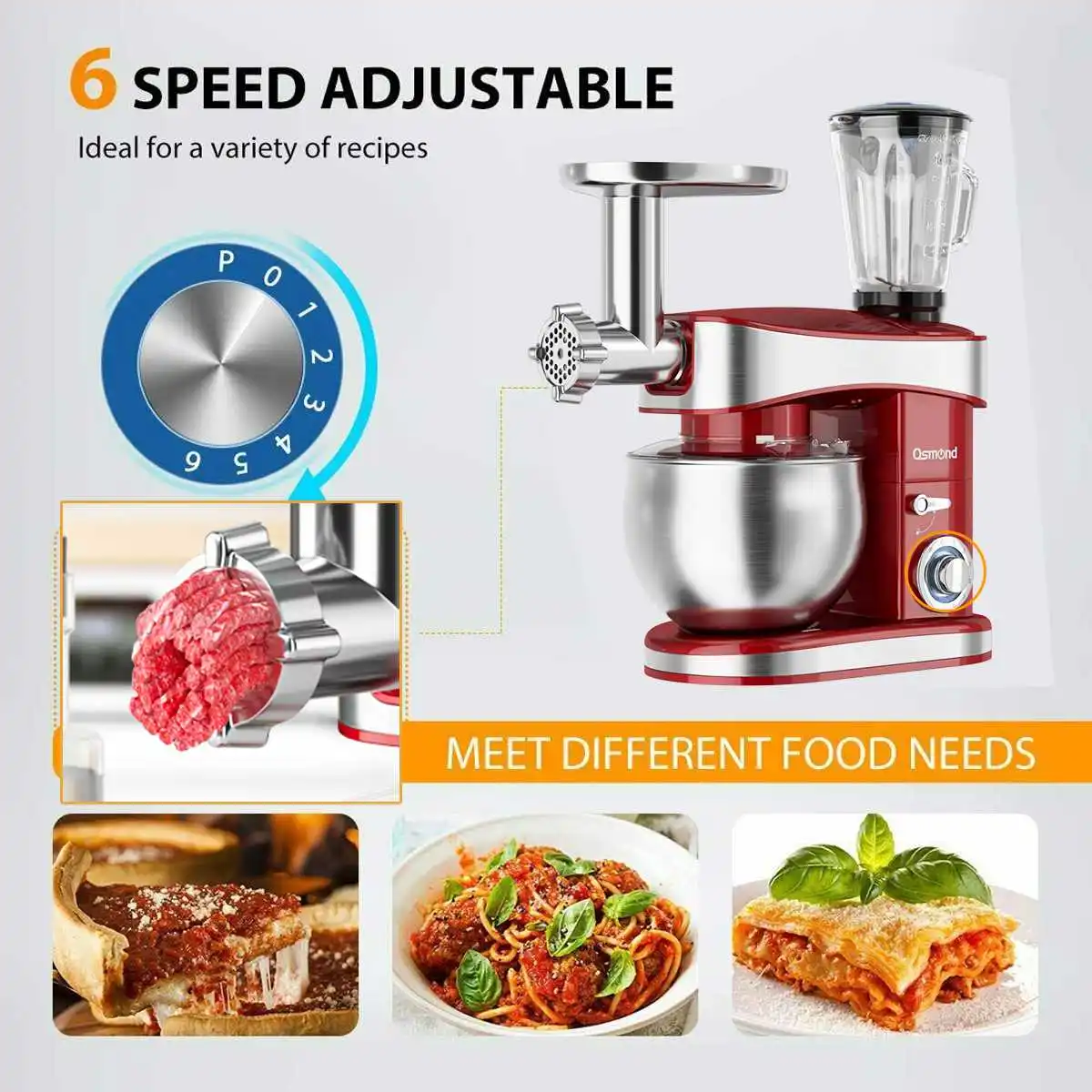Особенности:3 в 1 многофункциональный станокВключая блендер, мясорубку и соковыжималку.Высококачественный и пищевой материал из нержавеющей стали 304Безопасный и прочный без ржавчины, который безопасен для выпечки.6. Емкость 5лЕмкость и размешать легче, легко удовлетворить ваш пищевой желудок свободно контролировать размер сервировки, не тратя ингредиенты.Мощный двигатель из чистой медиПеремешивание без давления, высокая мощность и высокая скорость, быстрое рассеивание тепла и длительный срок службы, «биение» теста не замораживает.6-Скорость Бесплатная Скорость регулированияРазличная скорость setiing удовлетворяет ваши различные потребности, и поможет вам обработать каждую еду сердцемНастройка скорости панели управления:0 ------ стопНастройка 1-6 ------ рабочая скоростьНастройка 1 ------ минимальная скорость ------ медленнаяНастройка 6 ------ Максимальная скорость ------ быстраяУстановка P ------ высокая скорость-дробленый ледВращающийся дизайн прост в использовании, легко скручивается и удобен для установки.Прозрачный чехол для брызг, пусть он защитит ингредиентыПищевой стеклянный блендер, высокая термостойкость и долговечность при использованииНизкий уровень шума и эффективное использованиеСмеситель с низким уровнем шума не делает вашу кухню особенно шумной, грязной и грязной. Его можно замесить в тесто, смешать с пирожными или использовать для получения детского питания, салатов, соков, молочных коктейлей. Обработайте масло, сахар, пирожные и пиццу быстрее, экономя время и силы.Humanized дизайн, легко добавить материалы в любое время, чтобы предотвратить материал от брызг во время перемешивания.