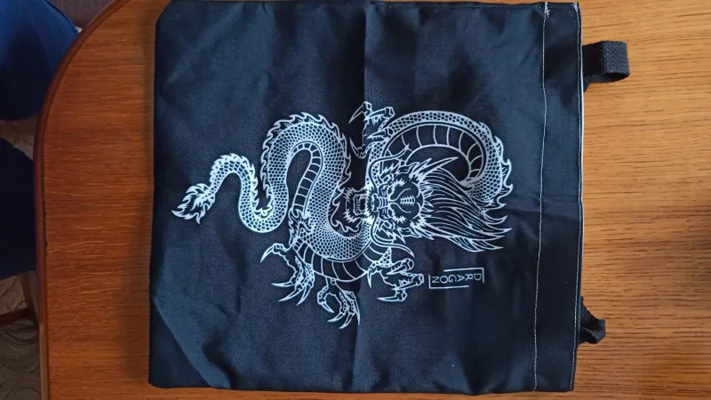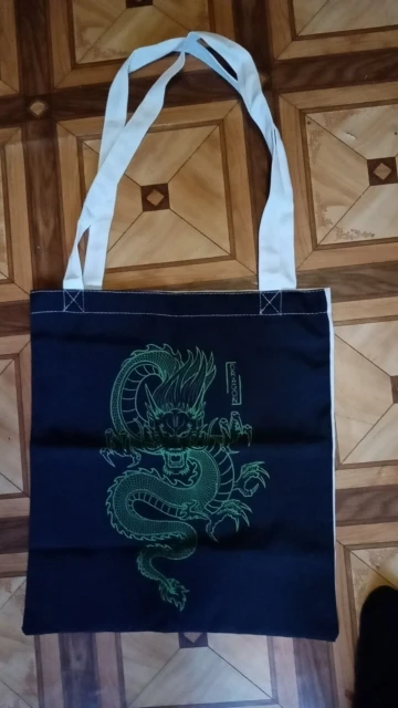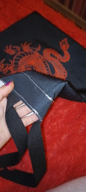 Заказ этого шопера, как русская рулетка. Кому то повезёт, кому то нет. Я, к сожалению, отношусь ко вторым. Заказывала обычный чёрный шоппер, с белым рисунком дракона. Видела у других, что он полностью чёрный. Но мне пришёл шоппер прошитый белыми нитками, что выглядит не очень. Внутри он белый. По форме квадратный. Рисунок на ткани напечатаны белым, но имеет какой то голубовато-зеленоватый отсвет. Открыла спор, мне вернули 3 доллара.