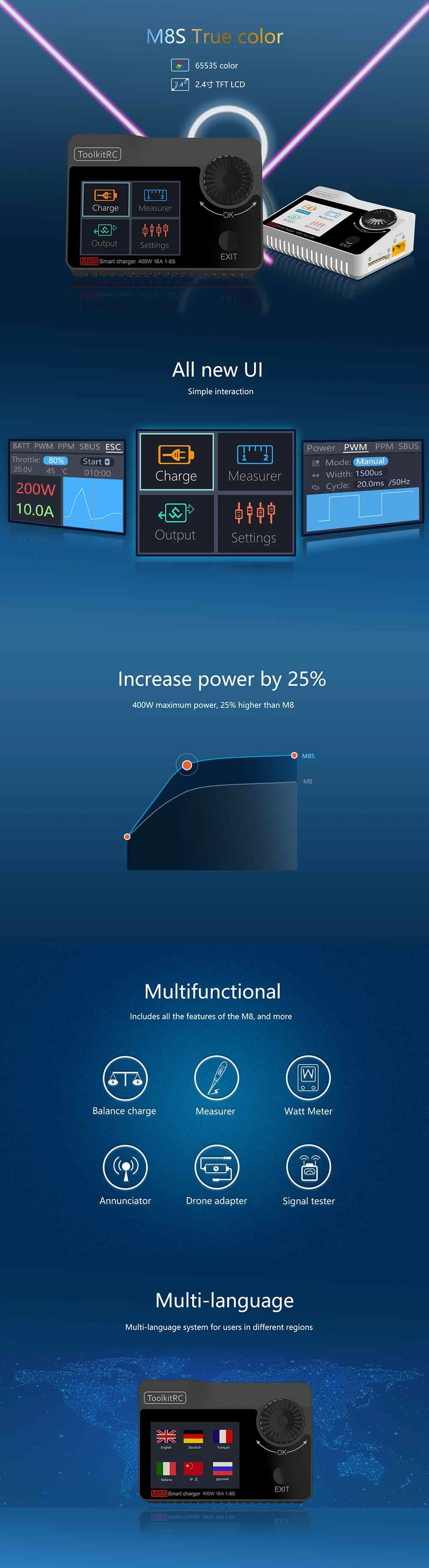 Новинка, балансирующее зарядное устройство ToolkitRC M8S 400 Вт 18A 2,4 TFT, с цветным ЖК-дисплеем, зарядное устройство Dis для 2S - 8S Lipo для радиоуправляемого гоночного дрона