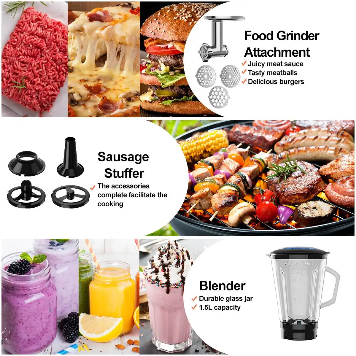 Посылка включает в себя:1x хост-машина1x крюк для теста1х плоская тарелка1 венчик1 шпатель1x мясорубка1x пищевой стеклянный блендер1x 6. 5л чаша из нержавеющей стали1х чехол-накладка1x Инструкция по эксплуатации на английском языке1 комплект колбас и киббе