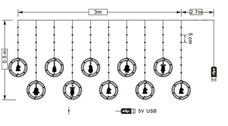 Наименование товара: Рождественский светильникЦвет излучения: теплый белыйВысота: 50 смОбщая длина нити: 300 смРазмер подвески: около 10 смПитание для струнного светильник: USBМатериал струнных огней: пластик, медьВодонепроницаемость: ДаРежим работы: мигающийДлительный срок службы:> 50000 часовСертификация: CE & RoHSПосылка: 1 шт. светодиодный светильникПрименение: спальня, окна гостиной, карнизы, открытые сады, украшения рождественской елки и т. Д.