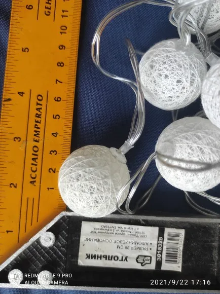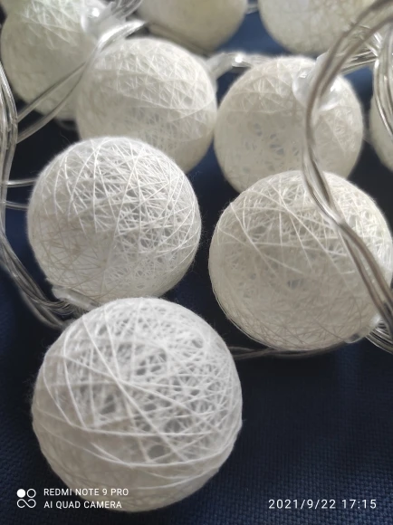 Описание: -Материал: хлопковая нить -Цвет: как на картинке -Форма Размер: шар Диаметр около 3,5 см -Кол-во: 20 хлопковых светодиодный шариков на одной линии -Провод Длина/педикюра задняя часть: около 2,2 м -Тип питания: на батарейках (аккумулятор 3xAA, не входит в комплект) -Стиль: ресторан, спа, отель, украшение дома/свадьба, день рождения, Рождество, Хэллоуин, вечерние или любые другие особые случаи -Посылка включает в себя: 1 струнный 20 светодиодный светильник Феи из хлопка
