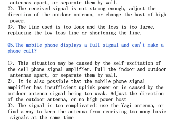 Затем проверьте ваш наружный сигнал с помощью мобильного телефона на вашем месте снова, сигнал должен быть 3-5 бар или-70DB--90DB на вашем мобильном телефоне, если ваш наружный сигнал очень плохой, бустер не может хорошо работать на вашем месте. Вы также можете вернуть товар на наш склад для возврата средств