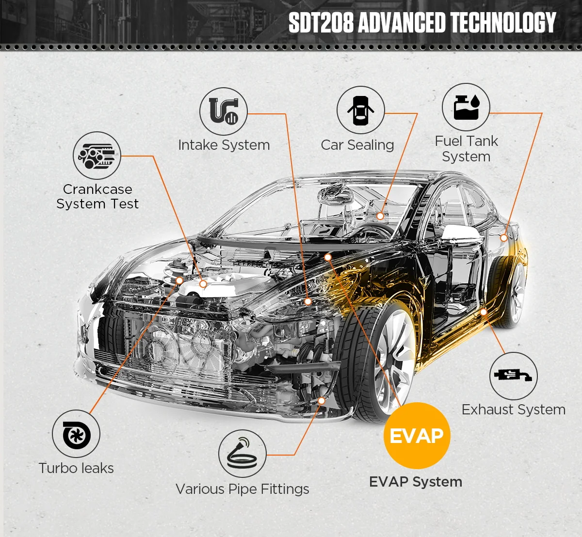 [Профессиональное Обнаружение EVAP]:В соответствии с техническими требованиями магазина по ремонту автомобилей EVAP. В SDT208 может обнаружить крошечный утечки отверстия до 0,5 мм и имеет hold-ограничения давления функция защиты от перегрузки в улавливания топливных паров (EVAP) режим, таким образом, чтобы защитить транспортное средство труб от повреждений.