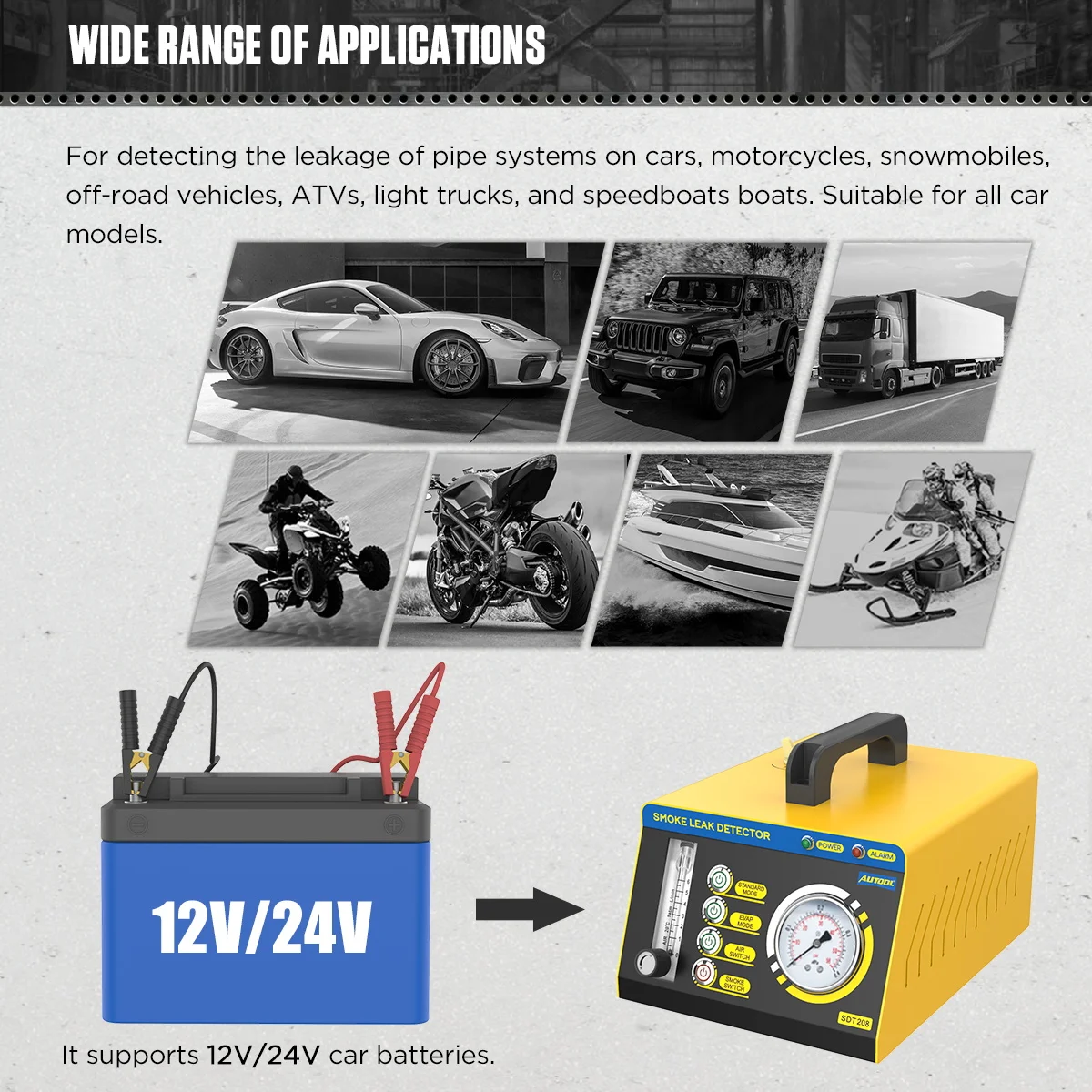 [Широкий спектр применения]:IT поддерживает 12V/24V автомобильные аккумуляторы. Для обнаружения утечки трубных систем на автомобилях, мотоциклах, снегоходах, внедорожниках, квадроциклах, лодках-светильник и скоростных лодках. Подходит для всех моделей автомобилей.