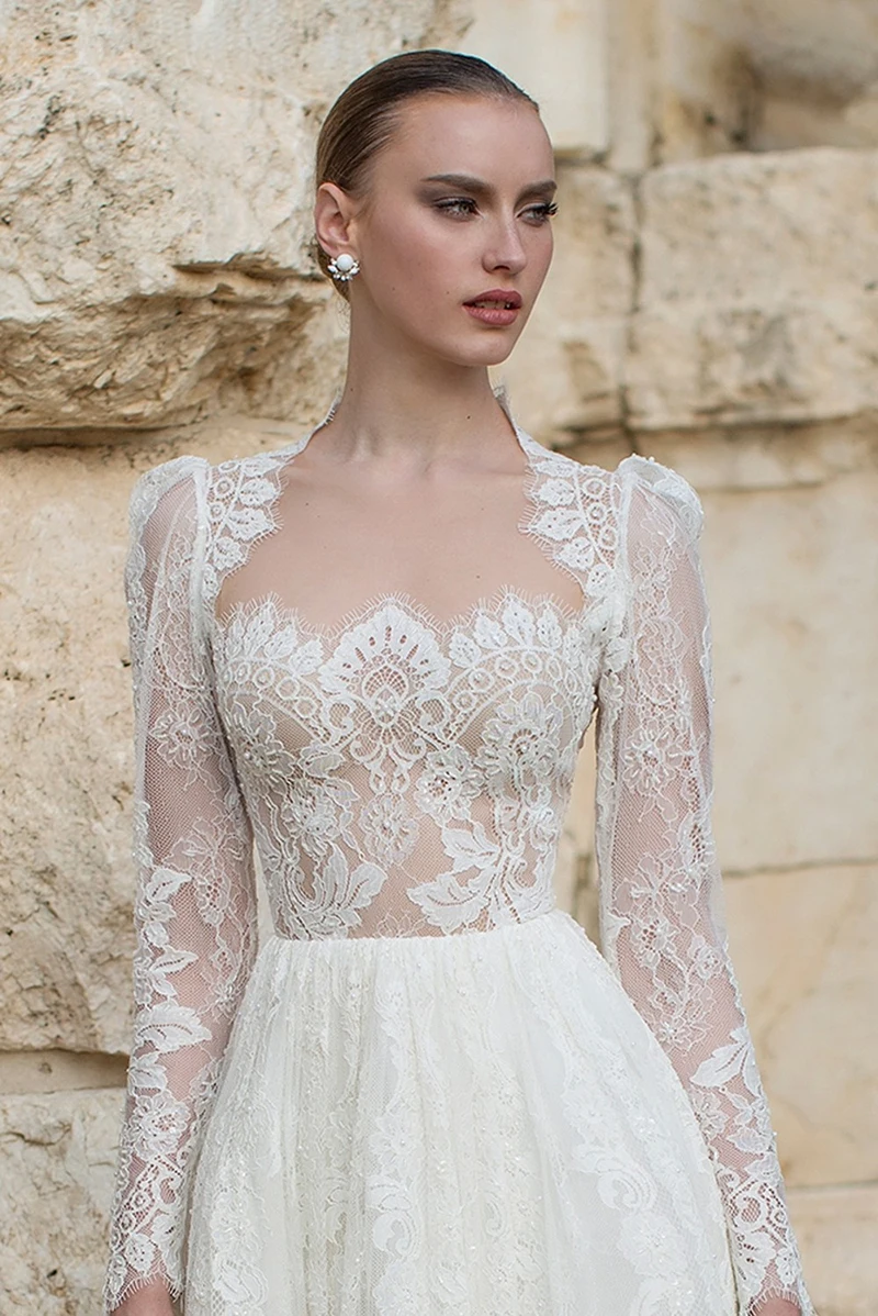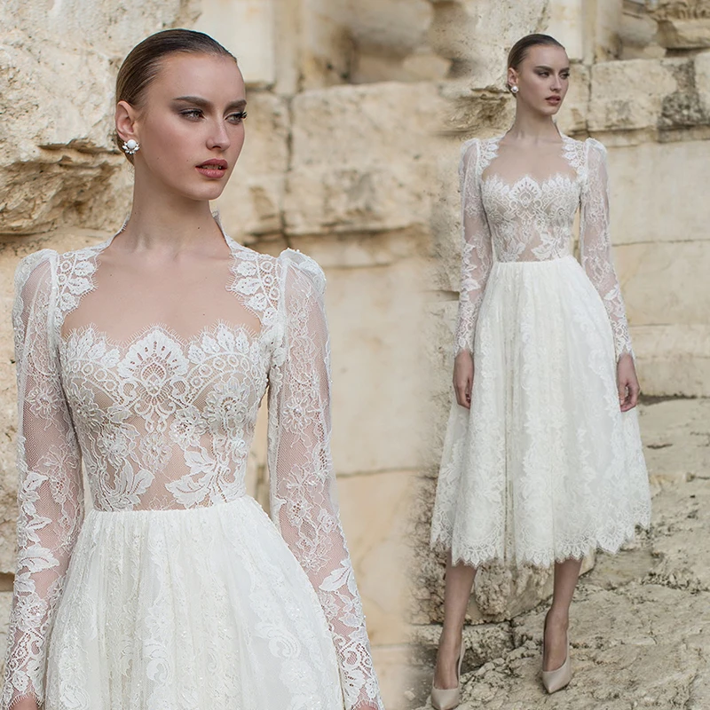 Женское кружевное свадебное платье, винтажное короткое платье до середины икры с длинным рукавом, без бретелек, цвета слоновой кости, 2021