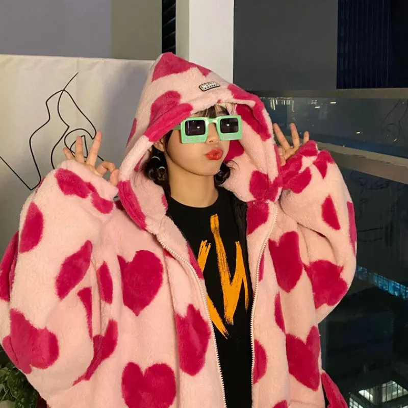 Женская плюшевая куртка в стиле Харадзюку с принтом в виде сердца, ...