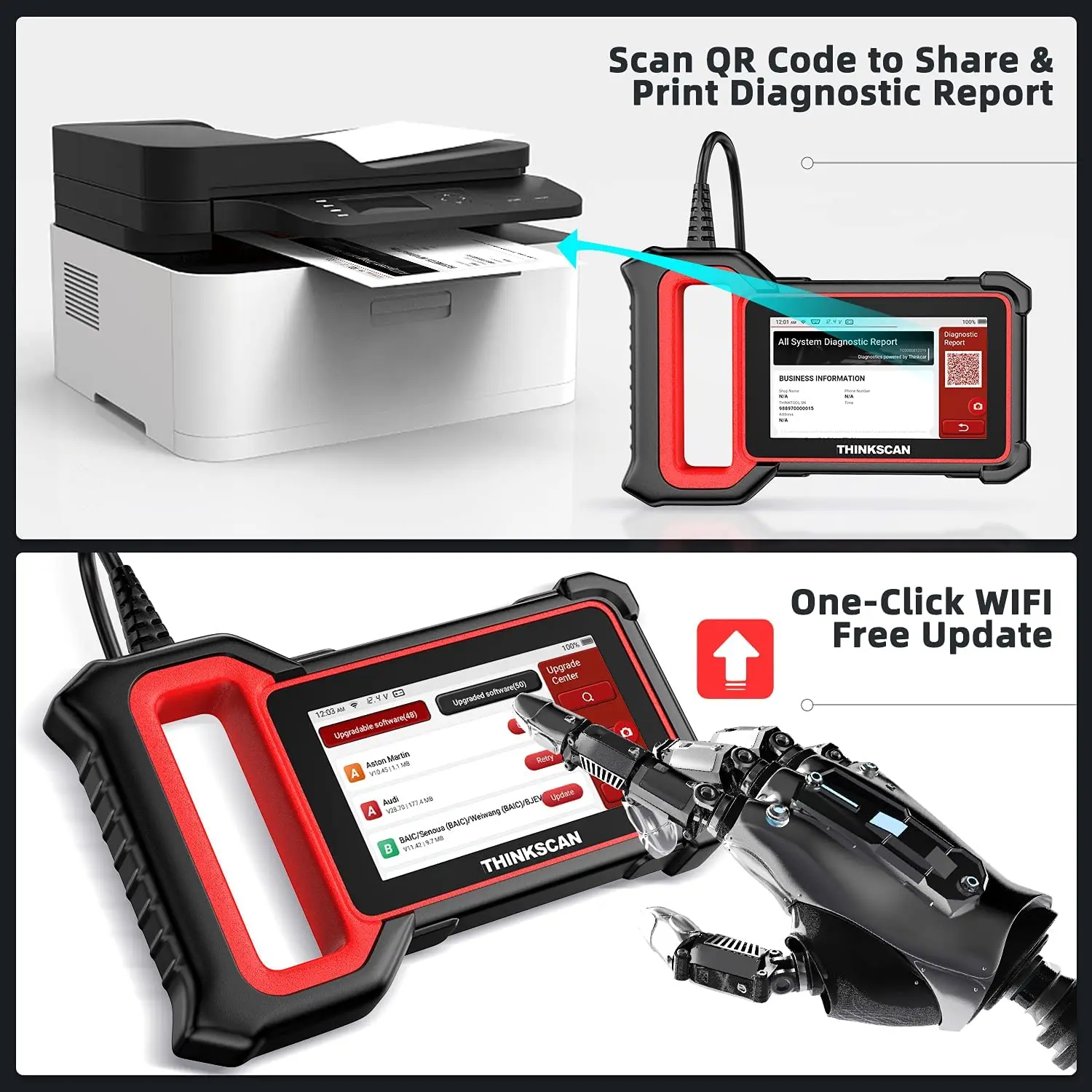 Сканирование qr-кода для обмена и печати диагностического отчета, одно нажатие обновление через Wi-Fi подключение