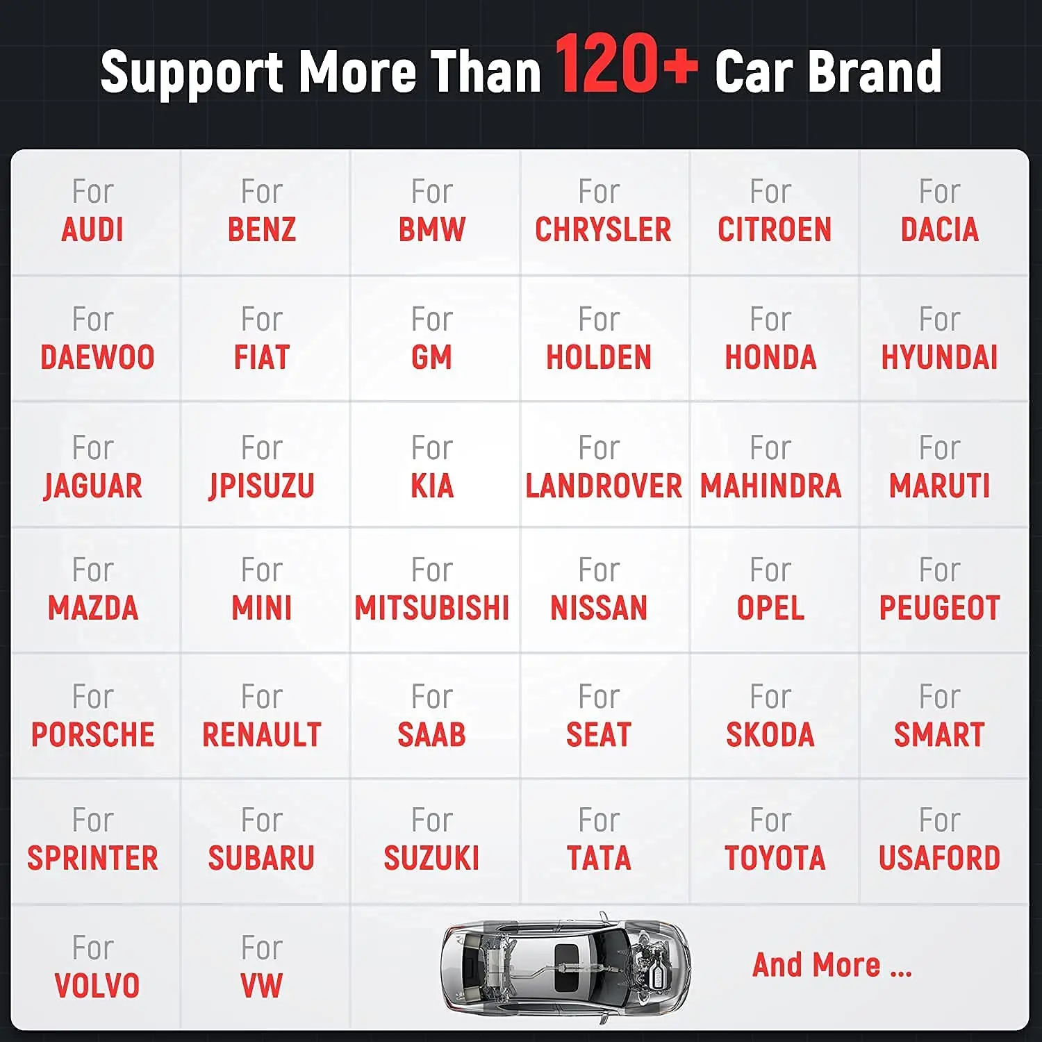 Диагностическое Покрытие Охватывает все транспортные средства, поддерживающие протокол OBD после 1996 года.Для AmercianДля Buick, для Chrysler, для Cadillac, для Chevrolet, для Doge, для AU Ford, для Бразилии Fiat, для Бразилии GM, для Ford, для GM, для Jeep, для Lincoln, для SGMДля европейскихДля Aston Martin, для Audi, для Alfa Remeo, для Abarth, для BMW, для Bentley, для Bugatti, для Citroen, для DR, для Dacia, для EU Ford, для Ferrari, для Fiat, для GAZ, для Iveco, для IZH, для Jaguar, для Land Rover, Для Lamborghini, для Lancia, для Mercedes, для Maserati, для Maybach, для Mini, для Opel, для Opel (Южная Африка), для PAZ, для Peugeot, для Porche, для Renault, для Rover, для Rolls-royce, для SAAB, для Seat, для Skoda, для Smart, для Sprinter, Для УАЗ, для ВАЗ, для Volvo, для Volkswagen, для Vauxhall, для ZAZДля АзииAcura, для Daewoo, для Daihatsu, для AU Holden, для Honda, для Hyundai, для Ikco, для Isuzu, для Infiniti, для Kia, для Luxgen, для Lexus, для Mahindra (Индия), для Maruti (Индия), для Tata (Индия), для Mahindra, для Maruti, для Mazda, Для Mitsubishi, для MVM, для Nissan, для Nissangtr, для Perodua (Малайзия), для Proton (Малайзия), для Perodua, для Proton, для Renault Samsung, для Saipa, для Ssangyong, для Subaru, для Suzuki, для Toyota, для Tlisuzu, для Соединенных Штатов Пакистан