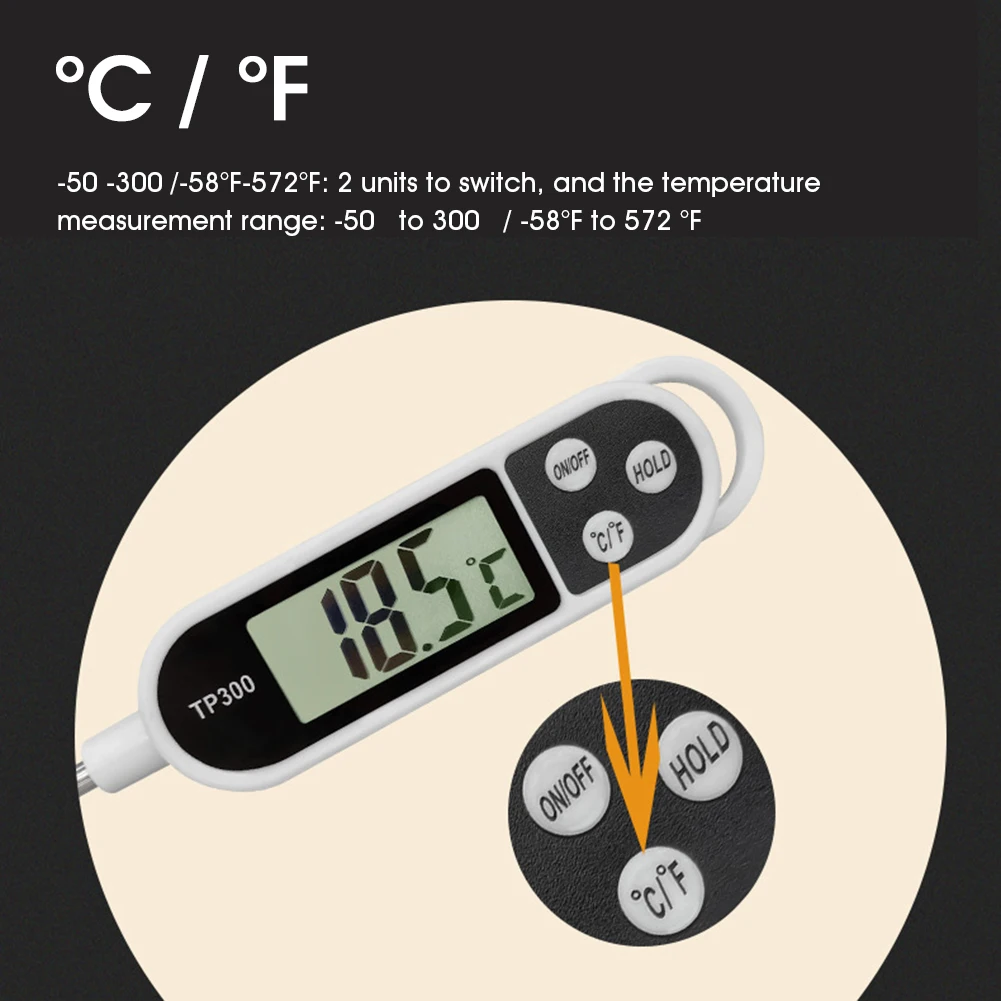 Description:*1. Material: stainless steel /PC plastic*2. Resolution: 0.1 C/F*3. Probe Length: 24 cm*4. Power Supply: DC1.5V*5. Measurement Range: -50°C ~+300°C (-58°F ~+572°F)Features:*1. Food-grade stainless steel probe delivers instant and accurate read.*2. Temperature range: -50°C to 300°C (-58°F to 572°F), ideal for cold and hot food.*3. LCD display shows read clearly, support functions of temperature memory and temperature hold.*4. Powered by 1.5V button cell, support 200 hours of continuous use.*5. Occasions: bars, kitchens, restaurants, tea shops, etc.Package Includes:1 x Kitchen Thermometer