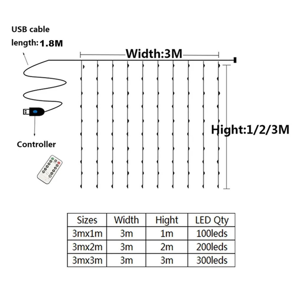 Цвет:Теплый белый/Разноцветный/фиолетовый/розовый/зеленый/красный/синийРазмер: ширина: 3 м * Высота: 3 м с 300 светодиодамиШирина: 3 м * высота: 2 м с 200 светодиодамиШирина: 3 м * высота: 1 м со 100 светодиодамиМощность питания: USB 4,5 VСрок службы: 6000 часовВодонепроницаемость: IP65, но USB не является водонепроницаемым, поэтому, пожалуйста, держите USB подальше от воды.Безопасно на ощупь: никогда не перегревайтесь после длительного использования, безопасно на ощупь.Переключатель 8 режимов: на USB или пульте дистанционного управленияС пультом дистанционного управления:Да (удаленный аккумулятор в комплект не входит)Применение: Свадебная вечеринка, украшение на день рождения, Рождество, Новогоднее украшениеПримечание:1. Поскольку указанные выше размеры измеряются вручную, фактический размер, который вы получите, может немного отличаться от указанных выше размеров.В то же время обратите внимание, что в связи с эффектами освещения, яркостью дисплея, настройками контрастности и т. д. могут быть некоторые незначительные различия между тоном изображения и реальным проектом.