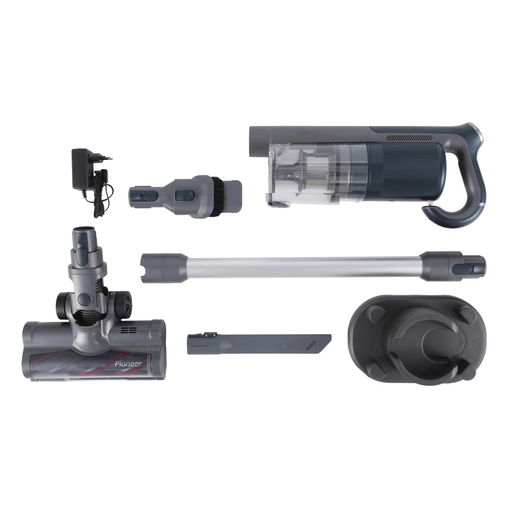 Рады представить новинку Pioneer - беспроводной вертикальный пылесос Pioneer VC451S с моторизированной щеткой с LED подсветкой и электронным управлением на ручке и док-станцией для удобного хранения.Наша модель имеет модификацию 2 в 1. Сочетает в себе компактный, функциональный вертикальный и съемный ручной пылесос с циклонной системой сбора пыли и грязи.Благодаря циклонной системе весь мусор собирается внутри пылесборника, где и остается пока вы не закончите уборку и не вытряхните содержимое в мусорное ведро. В пылесосе циклонного типа вся пыль и грязь находится в отдельном контейнере и не мешает воздушному потоку, что в свою очередь позволяет двигателю работать в постоянном режиме и положительно сказывается на сроке службы прибора.Пылесос Pioneer VC451S станет вашим незаменимым помощником дома, на даче и в автомобиле. С ним вы легко и быстро наведете порядок. Идеально подходит как для быстрой, так и генеральной уборки.Вертикальный беспроводной пылесос Pioneer с удобным электронным управлением на ручке, моторизированной щеткой выполнен в современном стиле и будет прекрасно смотреться как в классическом, так и в суперсовременном исполнении квартиры. Удобная эргономичная ручка изготовлена в форме трости и имеет конструкцию, повторяющее анатомическое строение руки, поэтому нашим прибором легко управлять даже одной рукой. Включение/выключение и регулировка мощности пылесоса не требует лишних движений, так как кнопки расположены в районе большого пальца. Все части соединяются между собой надежными креплениями, которые предотвратят разбалтывание узлов в процессе эксплуатации.Модель VC451S оборудована высокоэффективным HEPA ФИЛЬТРОМ, который имеет двойную систему фильтрации и сокращает до минимума количество выдуваемых частиц пыли и грязи, надежно задерживает споры грибков, бактерии, выделения пылевых клещей. Выпускаемый воздух чище, чем воздух в помещении, в нем задерживается до 99,9% всех аллергенных частиц размером до 0,3 мкм, что является идеальным решением для людей с особенно высокими требованиями гигиены. За моющимся HEPA фильтром легко ухаживать, при сильном загрязнении достаточно промыть его холодной водой.В комплект входит:– МОТОРИЗИРОВАННАЯ УНИВЕРСАЛЬНАЯ ЩЕТКА C LED подсветкой. Щетка оборудована шарнирным основанием и колесиками, позволяющими добраться до самых укромных уголков. В ней установлен съемный ролик для сбора мусора, который, при помощи кнопки легко снимается и чиститься. Крепление щетки осуществляется кнопкой. Для очистки затемненных мест в щетку встроена LED подсветка, что существенно облегчит уборку труднодоступных мест. Для дополнительного удобства маневрирования щетка оборудована 2 большими и 2 маленькими колесиками. Размер моторизированной щетки: длина - 24 см, ширина - 12 см, глубина - 5 см;– ЩЕЛЕВАЯ НАСАДКА - используется для уборки труднодоступных мест, углов, батарей, узких пространств между мебелью и стенами, в том числе с помощью такой насадки удобно производить уборку в автомобиле (между сиденьями, приборной доски, кармана в двери и других труднодоступных мест). Размер: 24 х 3,5 см.- ЩЕТКА ДЛЯ МЕБЕЛИ - имеет модификацию 2 в 1: с щетиной и без. При выдвинутой щетине производится уборка мягкой мебели, портьеры, занавески, торшеры, сиденья автомобиля и др. С убранной щетиной - удобно убирать батареи, узкие пространства и т