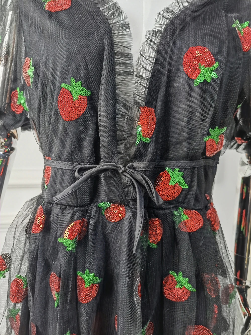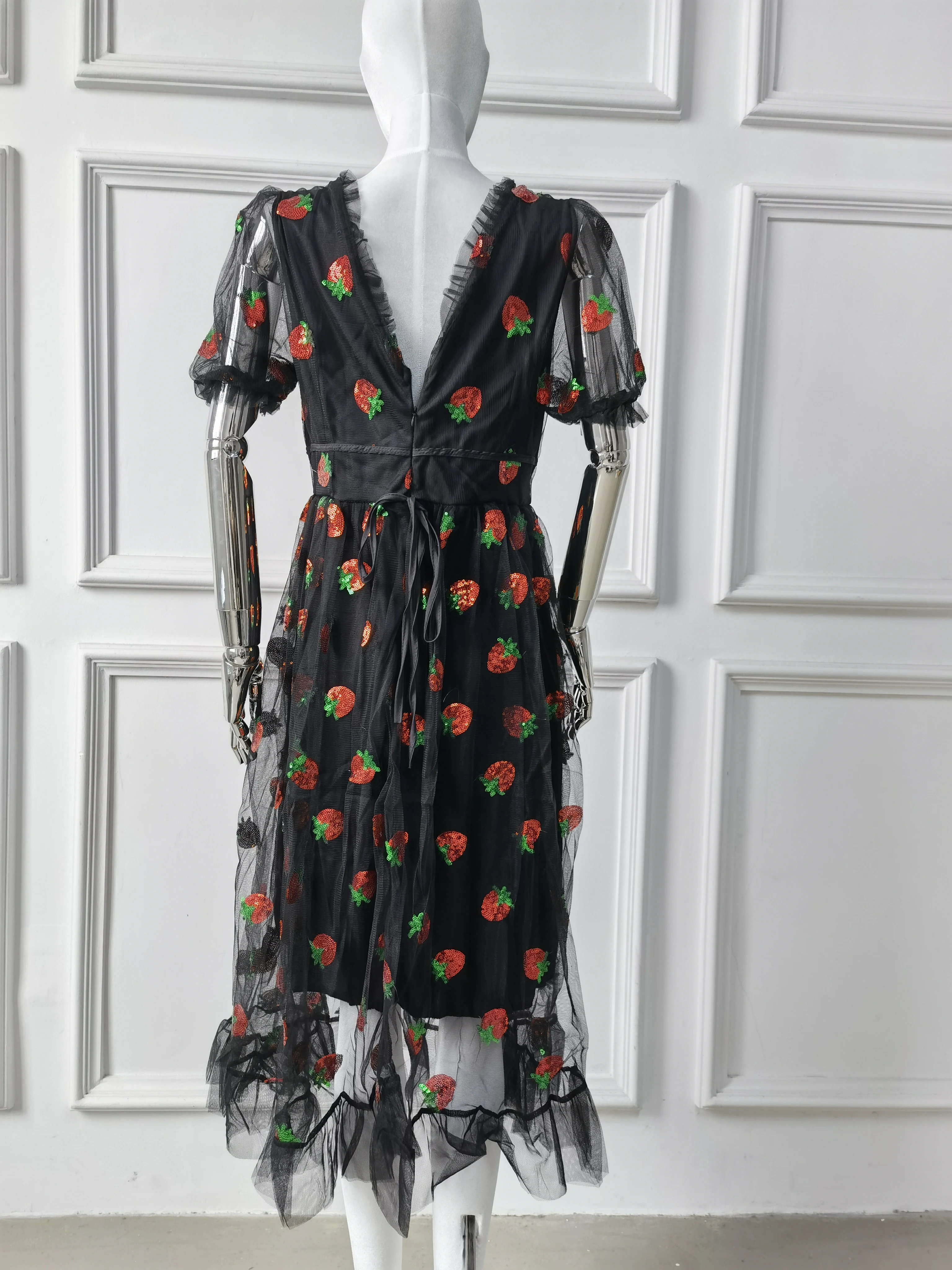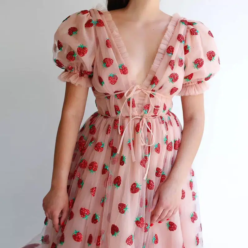 Женское Бандажное платье с клубничным принтом, кружевное сексуальное платье с глубоким v-образным вырезом и короткими рукавами-фонариками, элегантное платье с рюшами и сеткой Boho Vestidos