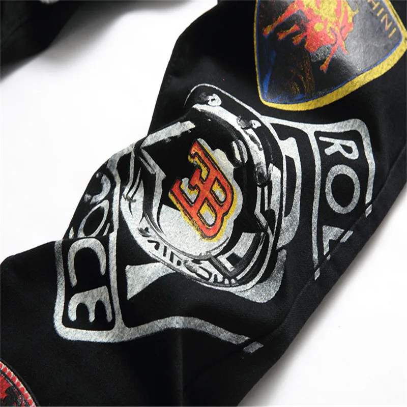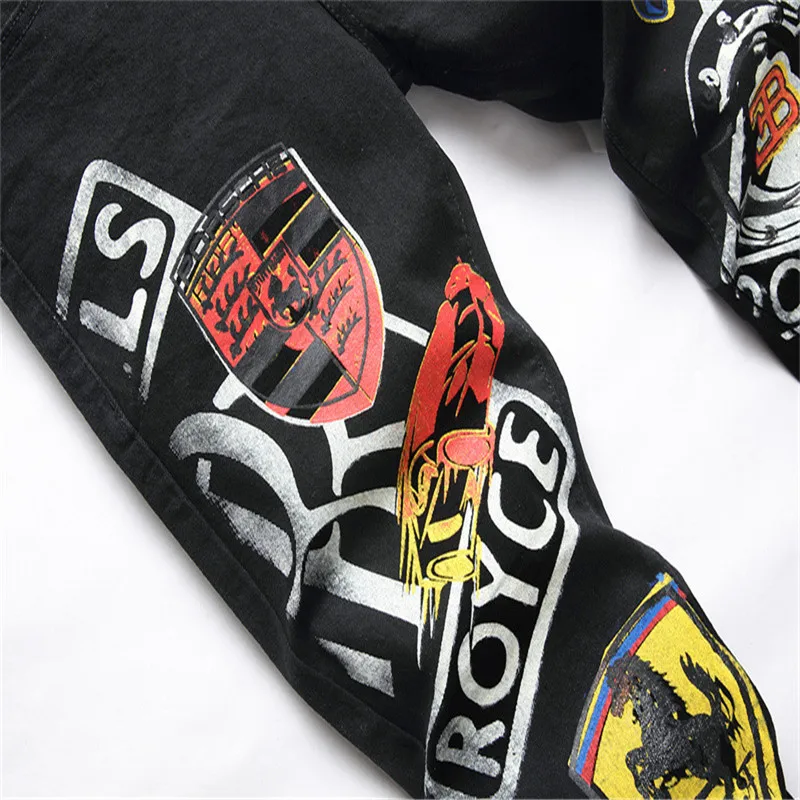 Новинка мужские облегающие эластичные черные мужские джинсы с монограмным принтом Молодежные трендовые Универсальные мужские брюки с меховой отделкой и средней талией в уличном стиле