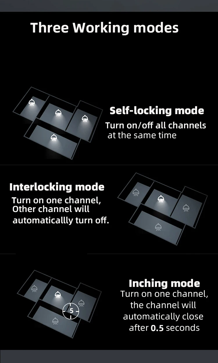1. Режим ввода: Переключение на один канал, канал будет автоматически закрыт через 0,5 секунд. Другой канал такой же, как и канал.2. Самоблокировка: каждый канал можно включать/выключать отдельно. Вы можете включать/выключать все каналы одновременно.3. Режим блокировки: Включите любой канал, остальные каналы будут выключены автоматически.