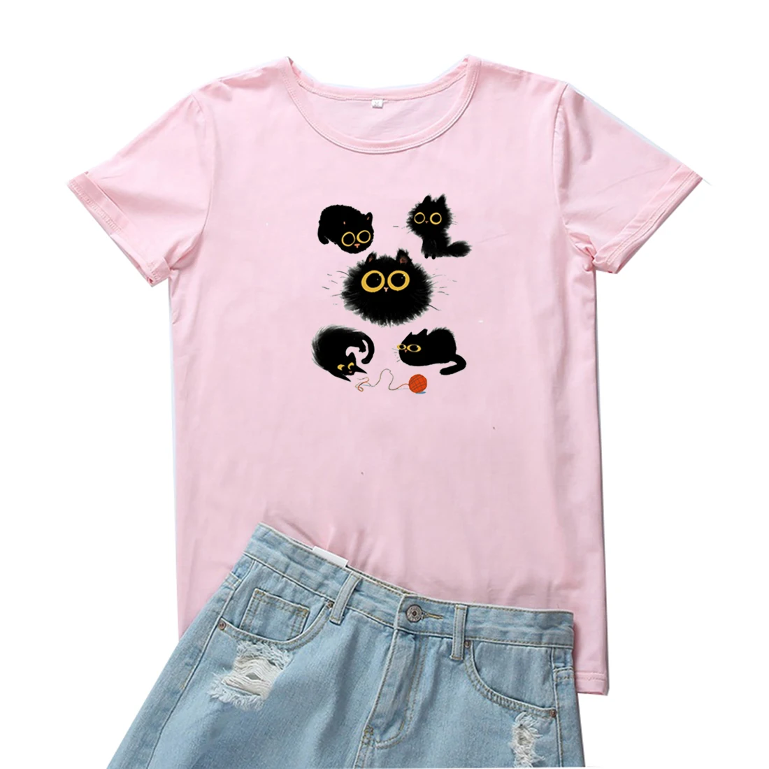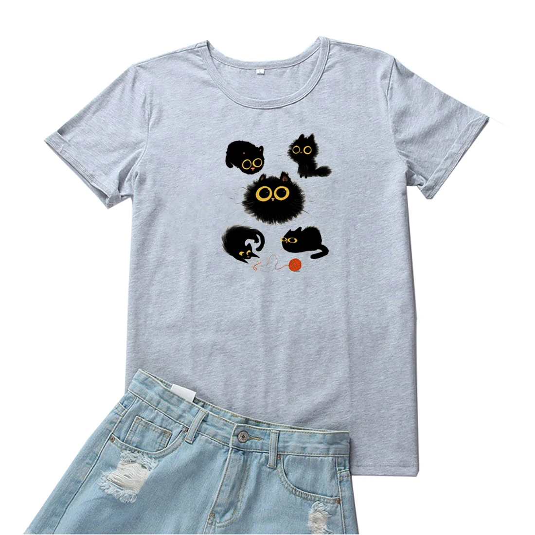 Футболка женская с круглым вырезом, милая графическая рубашка с принтом черных кошек, одежда на лето