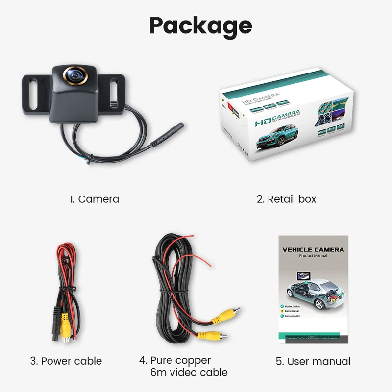1. Камера заднего вида2. Розничная коробка3. Кабель питания4. Видеокабель из чистой меди 6 м5. Руководство пользователя