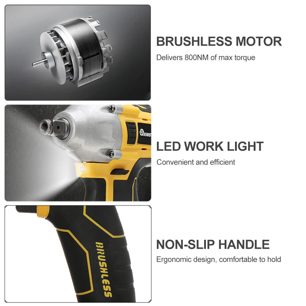 Особенности:-800N.M высокий крутящий момент, плавный Переключатель изменения скорости.-Мощный электрический гаечный ключ, многоцелевой, супер мощный.-Вал из вольфрамовой стали, высокая твердость и износостойкость.-Подходит для строительных площадок, технического обслуживания, деревообработки и т. Д.-Бесщеточный двигатель не генерирует искры, когда он работает, и двигатель не изнашивается.-Светодиодный светильник.