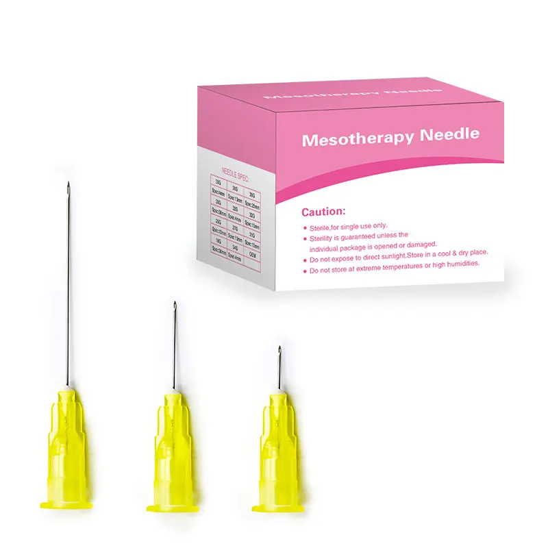Одноразовые Стерильные иглы имеют тройную заточку и силиконовое покрытие для безболезненного проникновения в ткань. Иглы стерилизуются оксидом этилена и поставляются в герметичных упаковках, которые легко открываются. Иглы изготовлены из хромово-никелевой стали. Наши кремниевые покрытые три лицевые конические иглы для мезотерапии в пяти различных размерах 27 г, 29 г, 30 г, 31 г и 32 г, идеально подходят для использования с PRP и наполнителями. Три различных длины иглы 4, 6 и 13 мм помогают сочетать любое применение мезотерапии