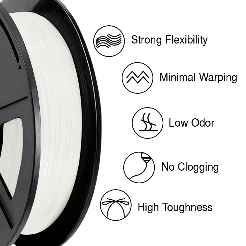 * Диаметр провода: 1,75/3,0 мм* Допуск: ± 0,03 мм* Температура печати: 205-230 ℃* Температура пола: не нужно нагревать* Сила тяги (кгс):/Индекс расплава: 5-8 г/10 мин (190 ℃, 2,16 кг)* Удлинение при разрыве: 600%* Скорость печати: 20-40 мм/сек.* Воздушные пузыри: 100% нулевые пузыри• Вес нетто: 0,5 кг