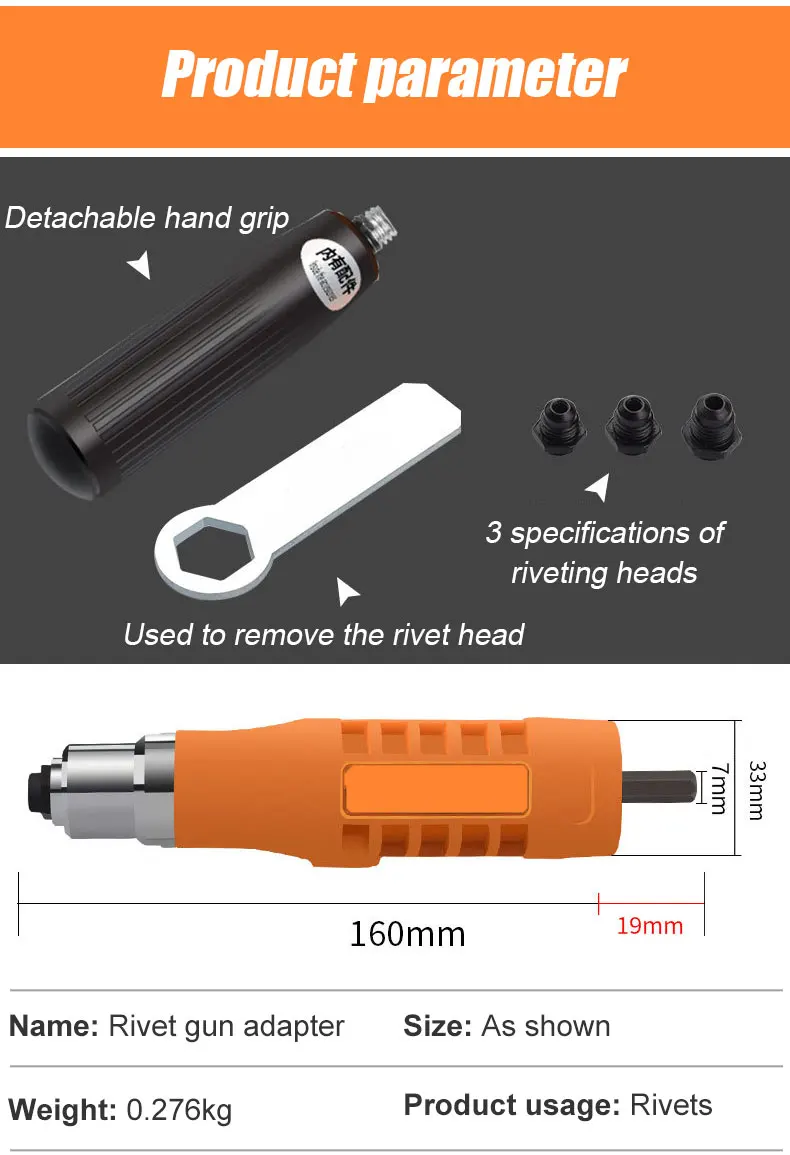 Съемная рукояткаИспользуется для удаления заклепки3 характеристики заклепочных головокНазвание: адаптер с заклепкамиРазмер: как показаноВес: 0,276 кгИспользование продукта: заклепки