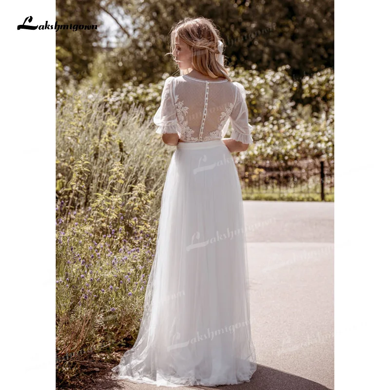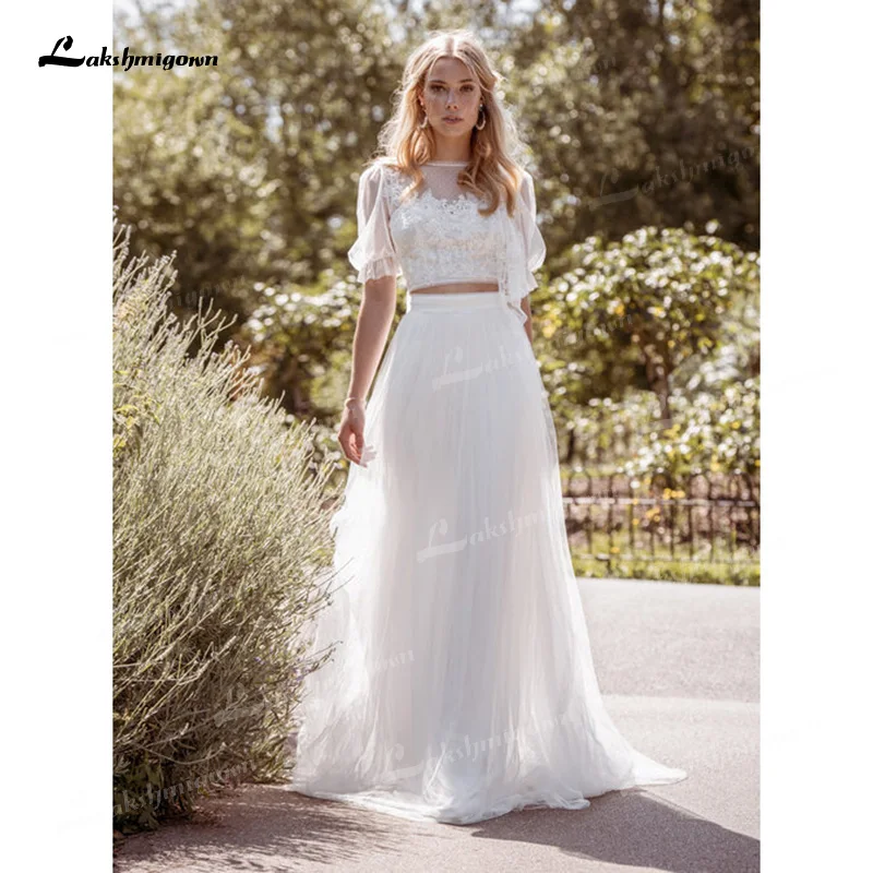 Уникальные свадебные платья из двух частей, иллюзионный кружевной и тюлевый топ с круглым вырезом и пышными короткими рукавами и шифоновая юбка, платья невесты со шлейфом