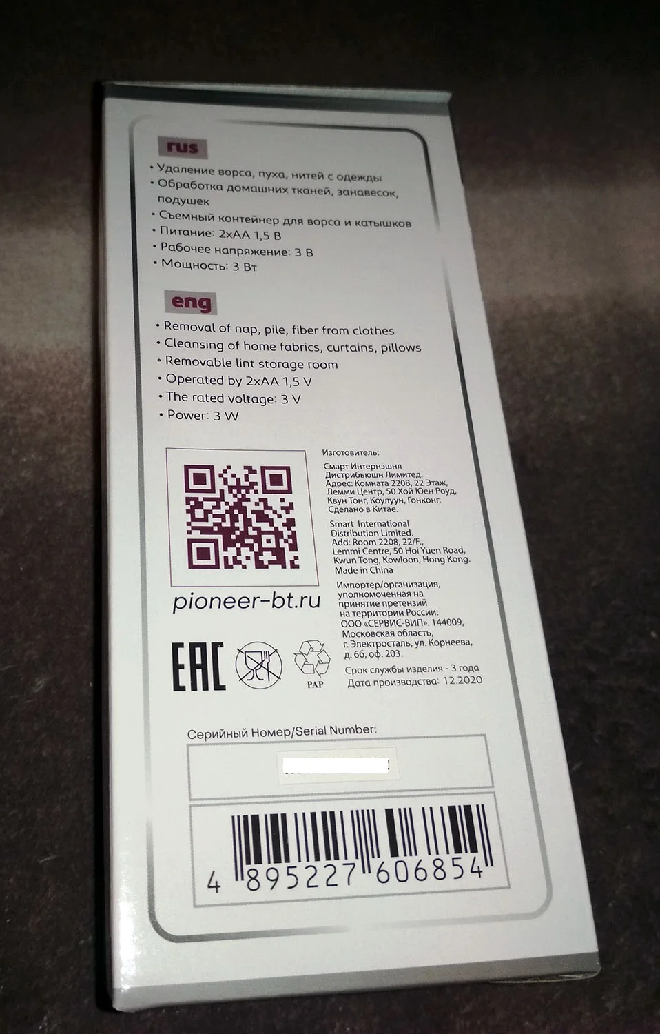 Упаковка приличная и безопасная (не помялось)-можно брать в подарок,материалы добротные.Главное вставить мощные батарейки (у меня Энерджайзер) и правильно и плотно к ножам закрутить сетку-очищает от катышков даже шерст.пальто,а тонкий шерст. платок еще быстрее! Для безопасности обязательно вынимайте батарейки перед чисткой! Если придираться: маленький отсек для мусора (надо часто откручивать и вытряхивать),гарантийный талон не заполнен (только наклеен серийник). Спасибо продавцу за товар и быструю доставку-пришло за 4 дня в Калуж.обл. в постамат в Пятерочке.