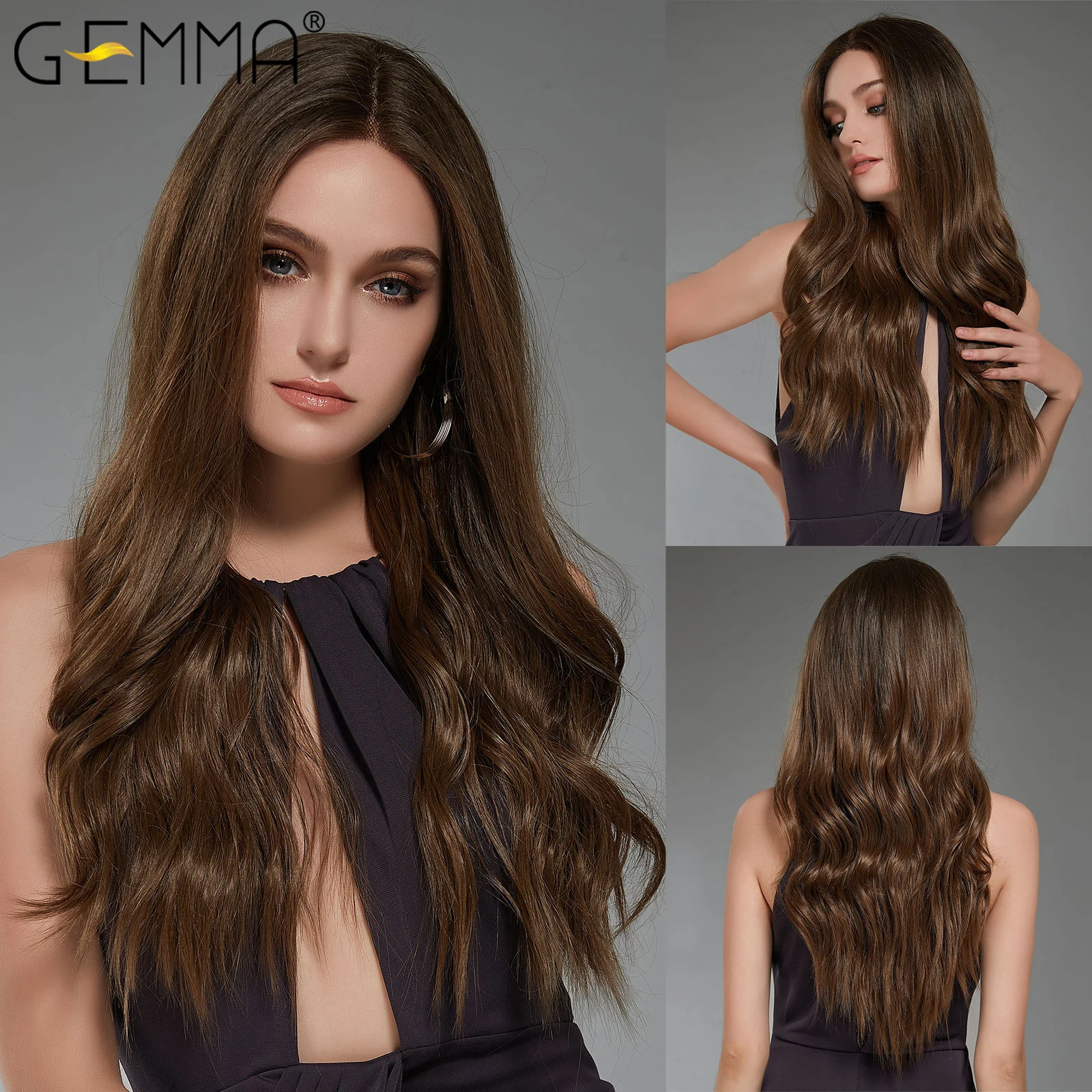 Парики из синтетического кружева GEMMA, длинные волнистые парики из коричневого кружева спереди для женщин, средняя часть, косплей, кружевные передние парики, термостойкие волосы