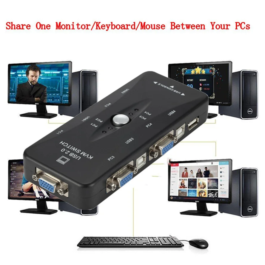 4-Порты и разъёмы KVM переключатель (KVM Кабели не входят в комплект) *Управление четырьмя компьютерами с одним набором клавиатуры, мыши и монитораСовместимость с XGA, SVGA, VGA и UXGAРазрешение: до 1920x1440Полоса пропускания: 200 МГцРучная кнопка переключенияПростая установка, просто подключите и играйтеПоддерживает Win/XP/7/8/10, WinNT, Netware, Unix, Linux;Идеально подходит для дома и бизнеса: с этим KVM переключателем и USB 2,0 вы можете управлять большим количеством usb-устройств, таких как принтер или флэш-накопитель. Используйте его для работы, видео встреч, обучения, конференции и многого другого. Вы можете использовать его дома и в офисе, помогая вам сэкономить время, место на столе и деньги.