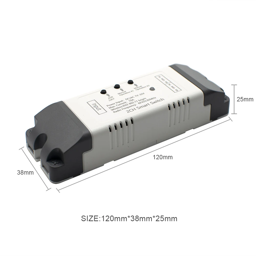 Cutover currenent≤ 10AВход USB 5 В (тип 2,4,5,6,7,8)Входное напряжение винтовой Клеммы:DC/AC7-32V (тип 1,3,5,6)AC85-250V (тип 2,4,7,8)Выход: Пассивный выход (сухой контактный выключатель)Рабочая температура: от-20 до 70 градусов ЦельсияРабочая влажность: от 40% до 80% относительной влажностиСтандарт WI-FI: 2,4 ГГц, IEEE802.11 b/g/n (не поддерживает 5G)Размер: 120*38*25 ммПриложение: eWeLinkАккумулятор RF433 пульта дистанционного управления: 27A 12 вольт постоянного тока (в комплект не входит)