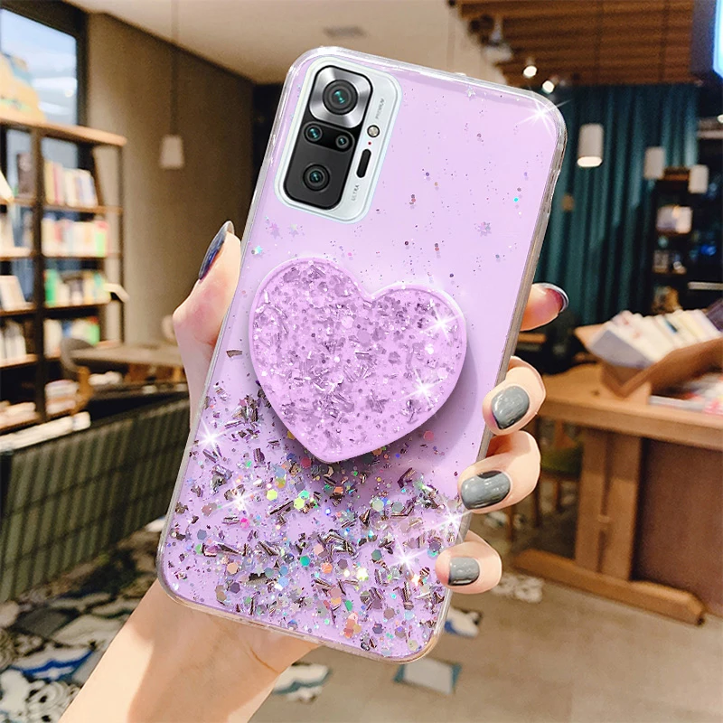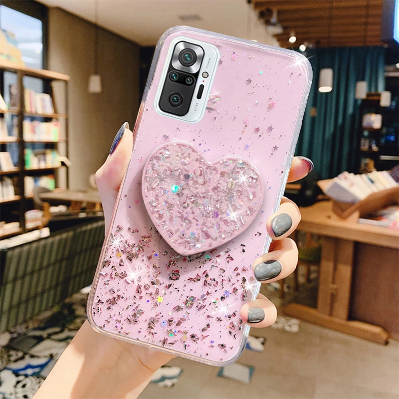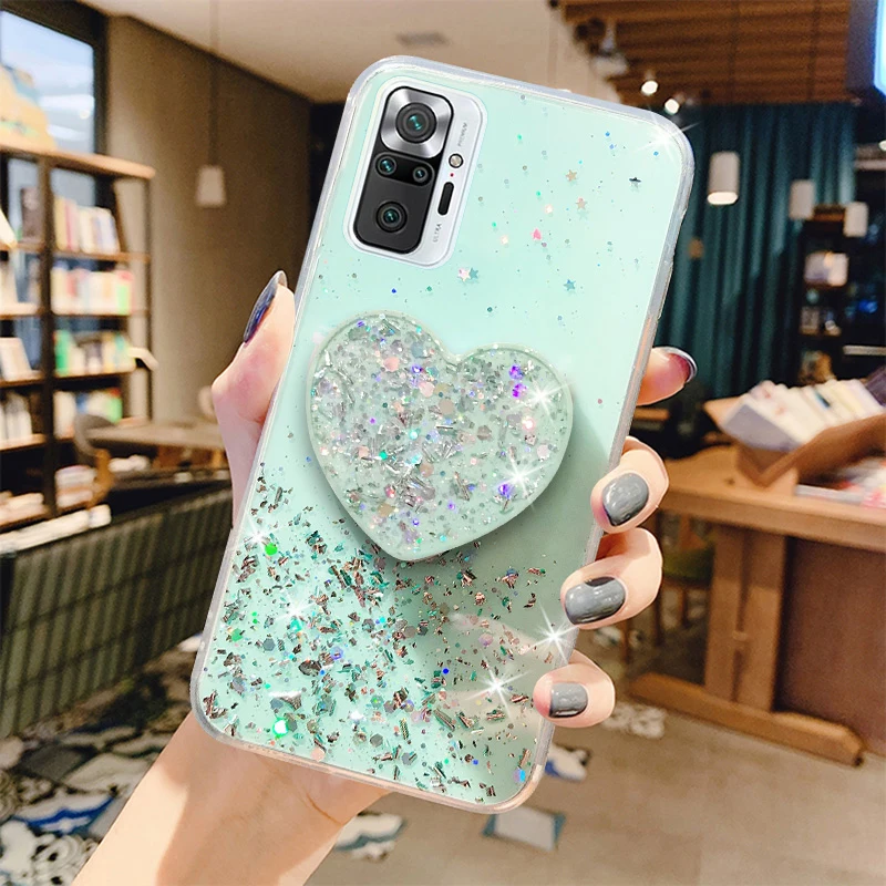 Блестящий чехол-держатель для телефона с сердцем и любовью для Xiaomi Redmi Note 10 Pro Max 4G, прозрачный мягкий силиконовый чехол из серебряной фольги 5G пробы