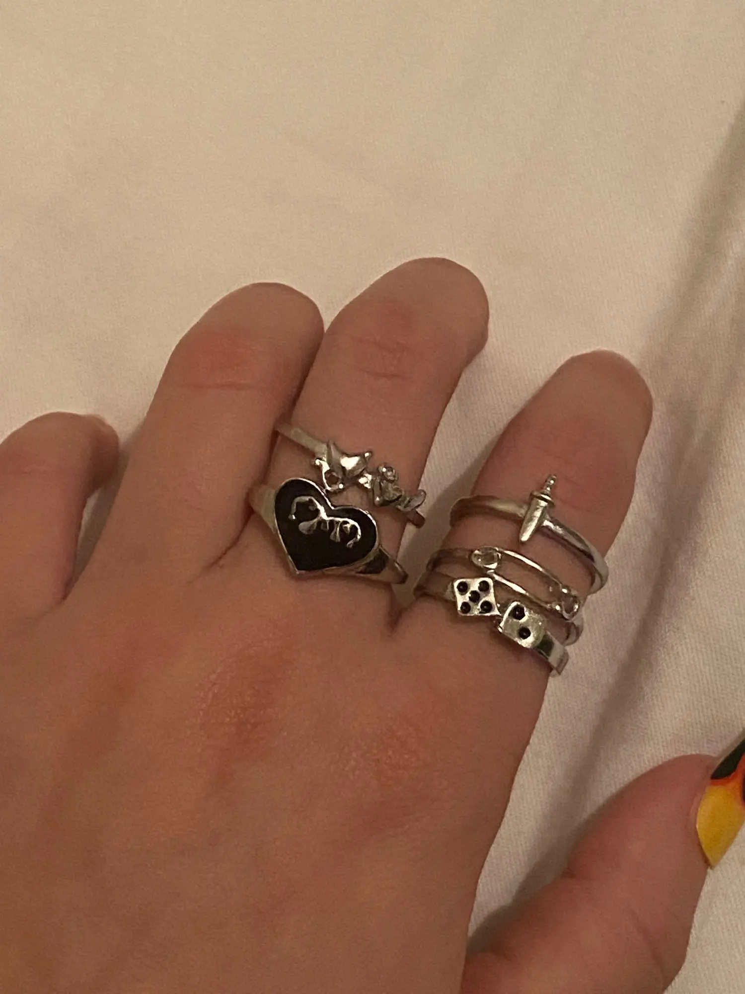 заказала такие кольца. Посылка пришла относительно быстро, но товар немного не соответствует тому что на фото, во-первых кинжал на кольце намного меньше чем на фото, во-вторых размер некоторых из них слишком большой