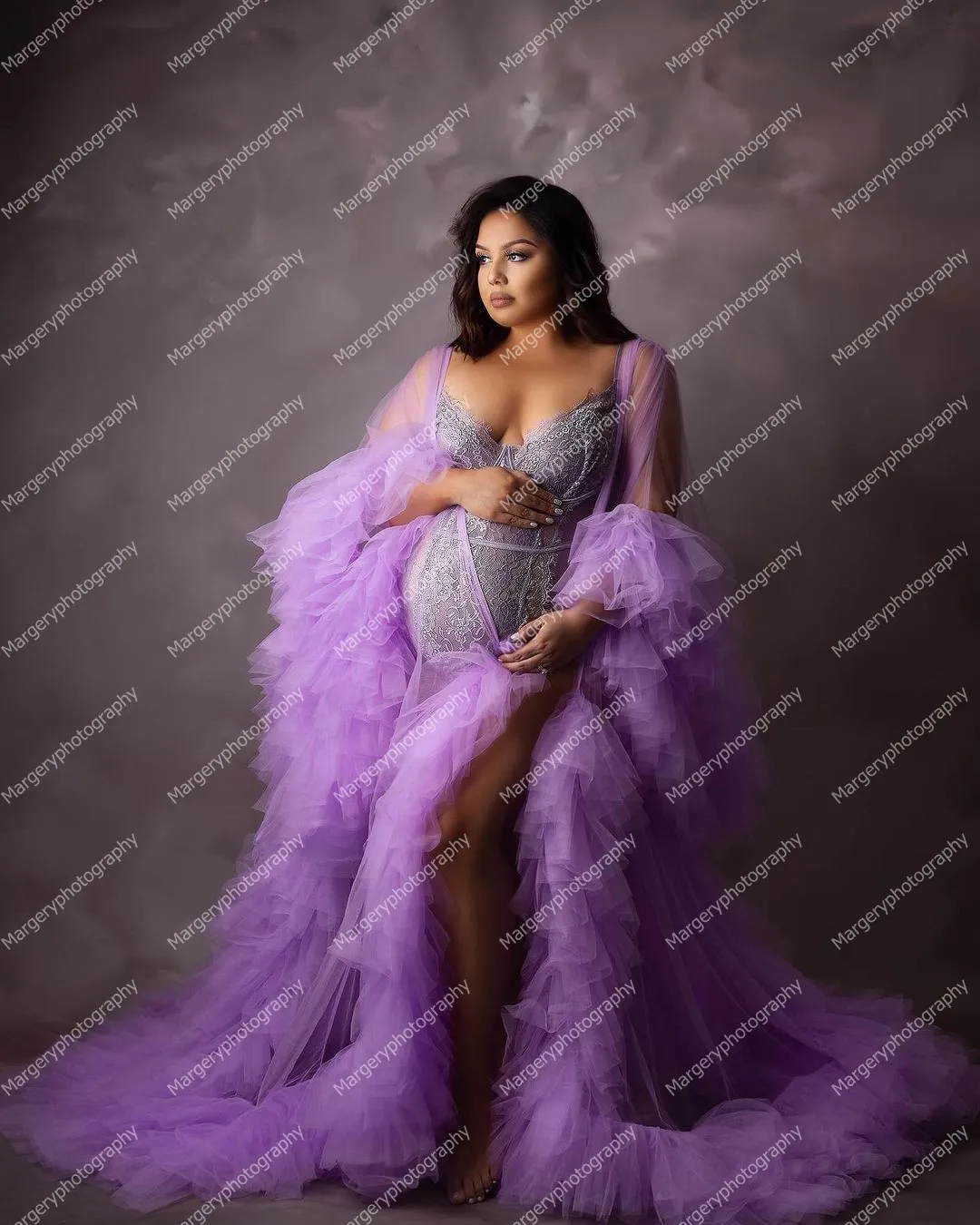 Платья для беременных, Классические фиолетовые, с длинными рукавами, сексуальные, прозрачные, с оборками и шлейфом, размера плюс