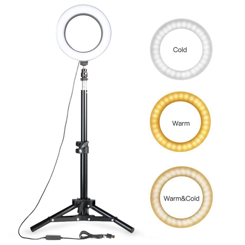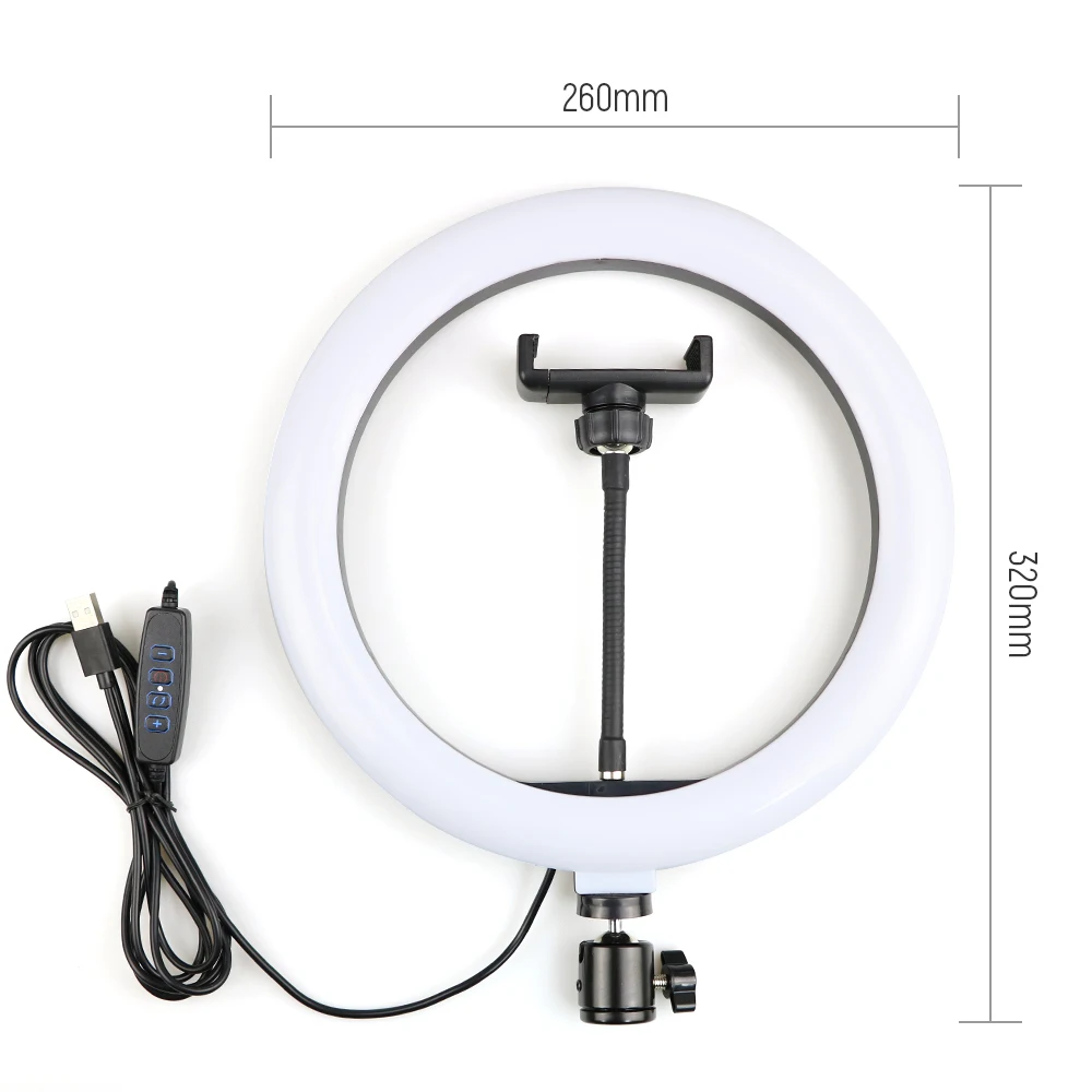 Кольцевой светильник для селфи 10 дюймов, 26 см, со штативом, держателем для телефона, светодиодная лампа для фотосъсветильникОсобенности:1. Регулируемое светодиодное кольцо светильник с широким диапазоном затемнения от 1% до 100%.2. Специальная светодиодная конструкция, легкий и портативный. Привод постоянного тока, низкие потери мощности.3. Отсутствие ультрафиолетового и инфракрасного излучения, низкое тепловыделение, Безопасность и защита окружающей среды.4. Длительный срок службы более 50000 часов.5. С усиленной гибкой рукой, которая будет свободно двигаться и никогда не упадет.6. Удлиненный шнур и сверхпрочные винты с большим пальцем.7. Широко применяется для наружного светильник щения фотографий, заполнения светильник в помещении, портрета, моды, свадебного искусства, рекламной фотографии, съемки видео и т. д. Характеристики:Светодиодные лампы: 120 шт.Люмен: 2400-3000Внешний диаметр: 26 смОбщая мощность: 10 ВтЦветовая температура: 3200-5500 кДиммируемый: ДаДиапазон затемнения: 1%-100%Рабочий Источник питания: 5 В постоянного токаПосылка1. Кольцевой светильник 26 см, штатив 1 + 0,5 мИлиКольцевой светильник 2,26 см, штатив 1 + 1,6 мИлиКольцевой светильник 3,26 см, штатив 1 + 2 м