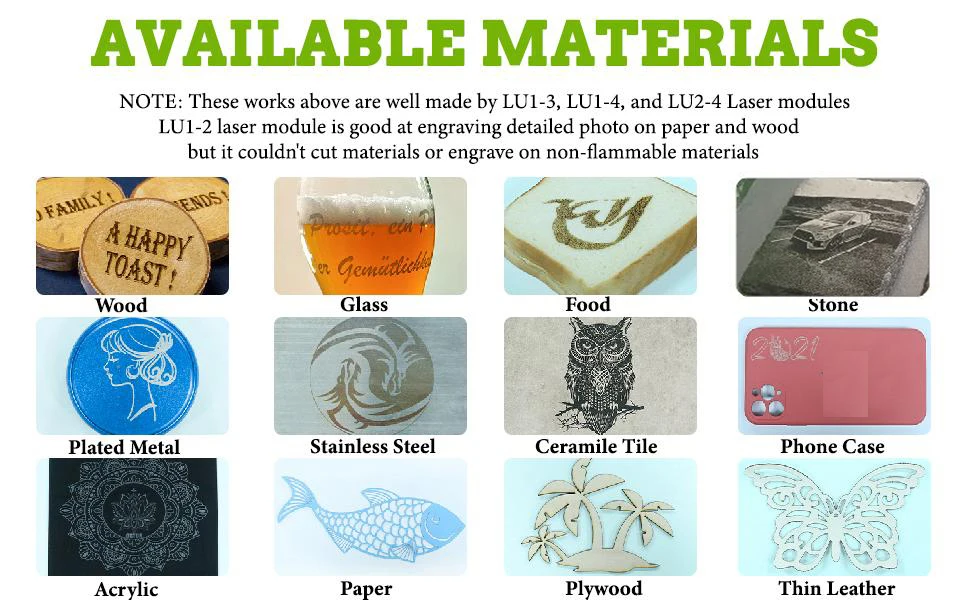 Main Features:●32-bit Motherboard with STM32 chip, more powerful, faster, higher precision Easy to adjust the speed. (0 - 3000mm / min) and power (S0 - S1000) for both engraving and cutting.● Anti-Shifting Protection, there is a G-sensor on the motherboard for active position protection. If the machine detects unauthorized movement, the laser beam will stop.● Laser Beam Safety Guard, if your computer system halted, led to that the laser engraver stop moving, the laser beam will stop.● LaserGRBL is the most popular carving software worldwide, runs well in both of Mac and Windows OS, could import different format images such as BMP, JPG, PNG, NC, DXF, etc. you could perform complex editing in PhotoShop, Inkscape, CAD , etc. and then connect to the laser engraver via LaserGRBL for engraving and cutting.● This laser engraver supports PWM mode.● Compatible with a variety of powerful laser units, such as 445 ± 5nm 7W laser unit, 445 ± 5nm 12W laser unit and 445 ± 5nm 20W laser unit.● Pre-assembled parts, just need several minutes to set up the machine.● It's easy to adjust the lens focus ring to adjust the laser focus to be the smallest light spot.●130 x 150mm engraving area.Specification:● STM32 Motherboard + 32Bits Firmware● Frame Material: Aluminum + Acrylic● Power Adapter Output: 12V 3A● Laser Module Electrical Power: 7W (default option), 15W (optional), 20W (optional)● Laser Wavelength: 445 ± 5nm● Available Image Format: .nc, .dxf, .bmp, .jpg_.webp, .png, etc.● Computer System: Win XP, Win 7, Win 8, Win 10, Mac OS● LightBurn ( paid software, lightburnsoftware dot com ) supports Windows, Mac OS, and Linux. It's the most popular paid carving software in the world, very easy to use.Attention:● Do not operate laser without eye protection (laser goggles)● Please set up this laser engraver in the fireproofing area, with good ventilation.● Please keep minors (especially kids younger than 14 yours old) away from this laser engraver. Minors of any age should not use this laser without direct Adult supervision and proper eye protection● Please avoid strongly impact on the machine.● Please do not touch the laser beam with your hands or any other objects you do not wish to engrave / burn / cut. Serious physical harm is possible if used improperly.● Please do not touch the heat sink, when the laser engraver just stop working, it may scald your hands.● Please take care of the laser engraver when it is working.