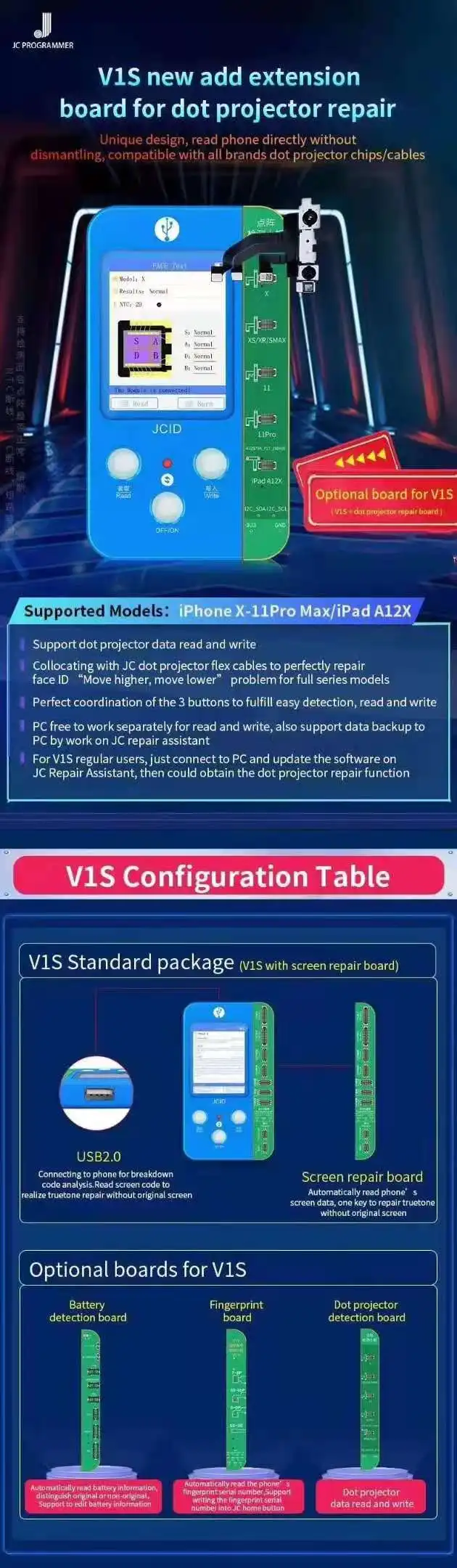 JC V1S с новой точечной проекторной платой для ремонта iPhone, распознавание лица, перемещение выше или ниже, JC V1S Dot проекторная плата используется для обнаружения гибкого кабеля для проектора iPhone Dot, И считывает и записывает данные для нового гибкого кабеля точечной матрицы, JC V1S плата для ремонта точечного проектора для решения проблем с распознаванием лиц по программированию JC матричный гибкий кабель, подходит для iPhone X / XS Max / XR / 11 / 11 Pro / 11 Pro MAX