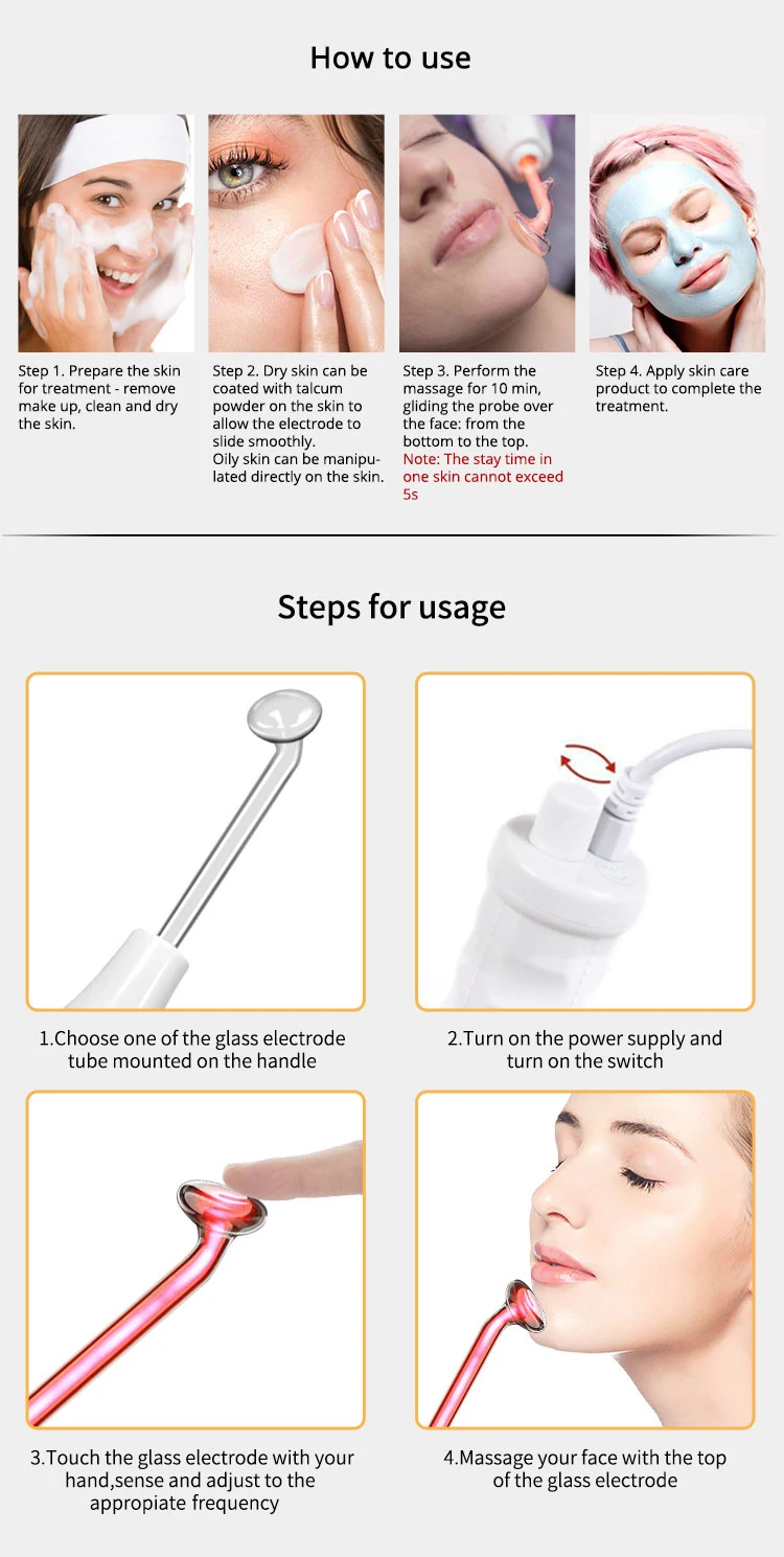 Это через стеклянную электродную трубку для получения высокочастотного тока и нанесения на лицо, тело, волосы, таким образом, достигает результата лечения.