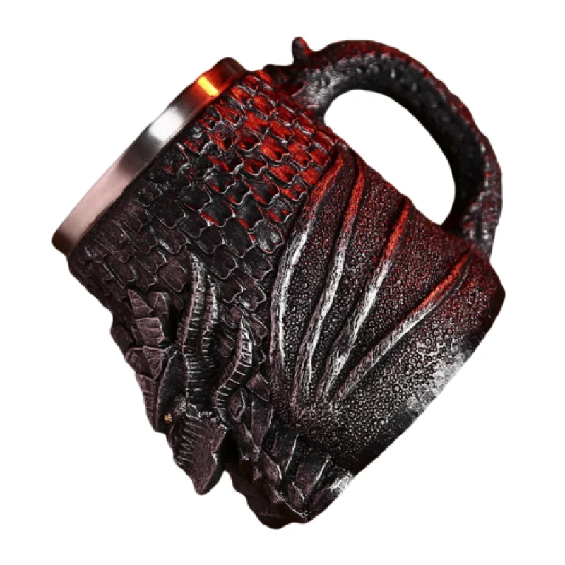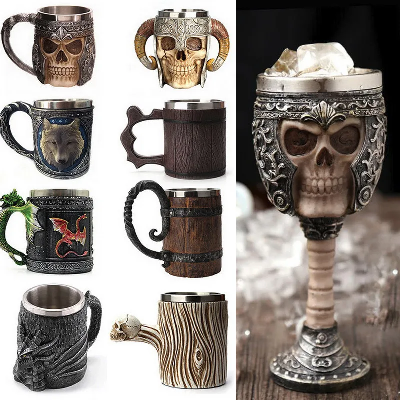 Особенности:<Премиум качество: изготовлен из высококачественной нержавеющей стали 304 и смолы, нетоксичный материал, без вредных веществ<Идеальный подарок или декор: 3D Реалистичный дизайн, идеальный средневековый подарок и коллекция, Хэллоуин и другие праздники.<Одиночная Ручка: спроектирована с одной ручкой, удобна для захвата.<Широкий рот: легко добавить напиток и удобно чистить.<Широкое применение: идеально используется в качестве молока, какао, кофе, пива и холодного напитка.<Легко чистить: просто краску проточной водой и сделать ее сухой.