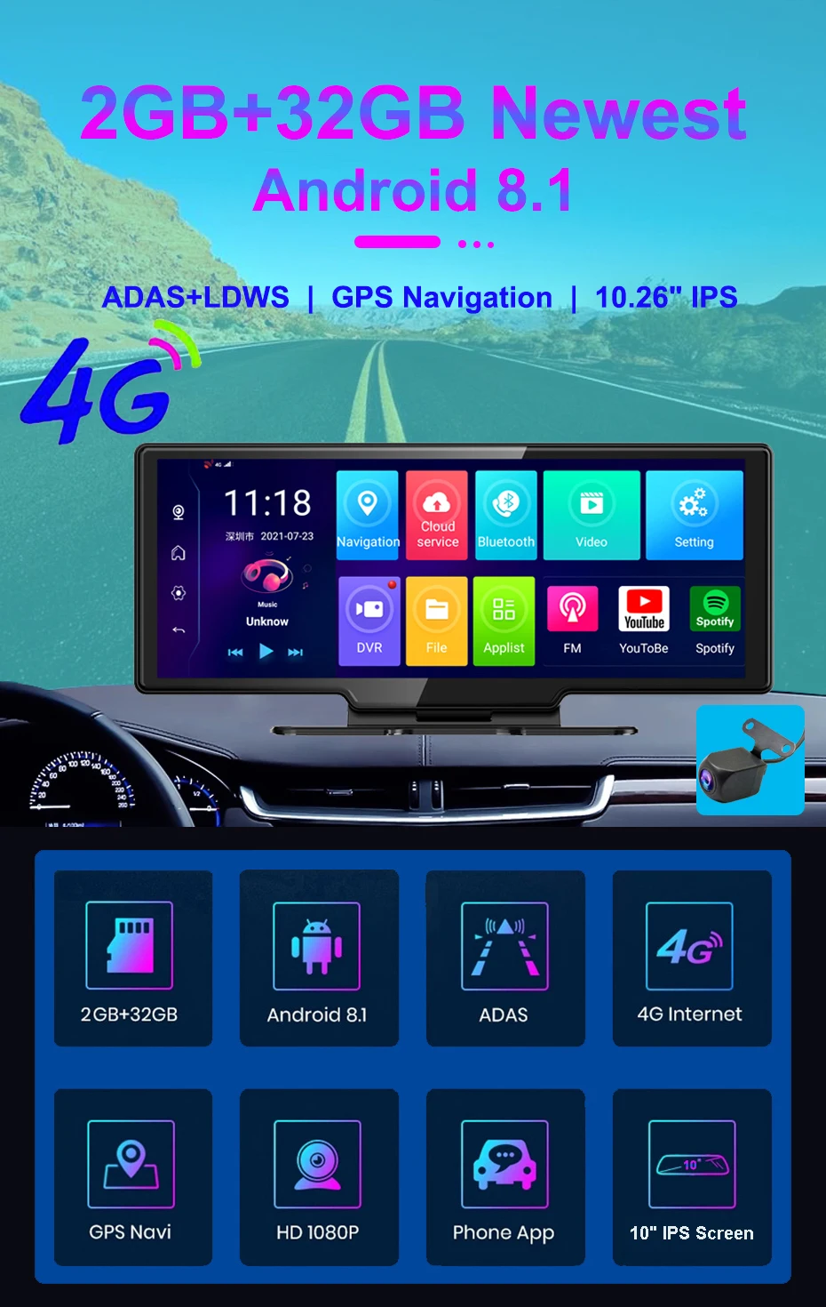 Четырехъядерный 1,4 ГГц высокопроизводительный процессор включает Android 8,1 интеллектуальных систем. Это делает Автомобильный видеорегистратор более быстрым. Вы можете скачать любое приложение из магазина google play.