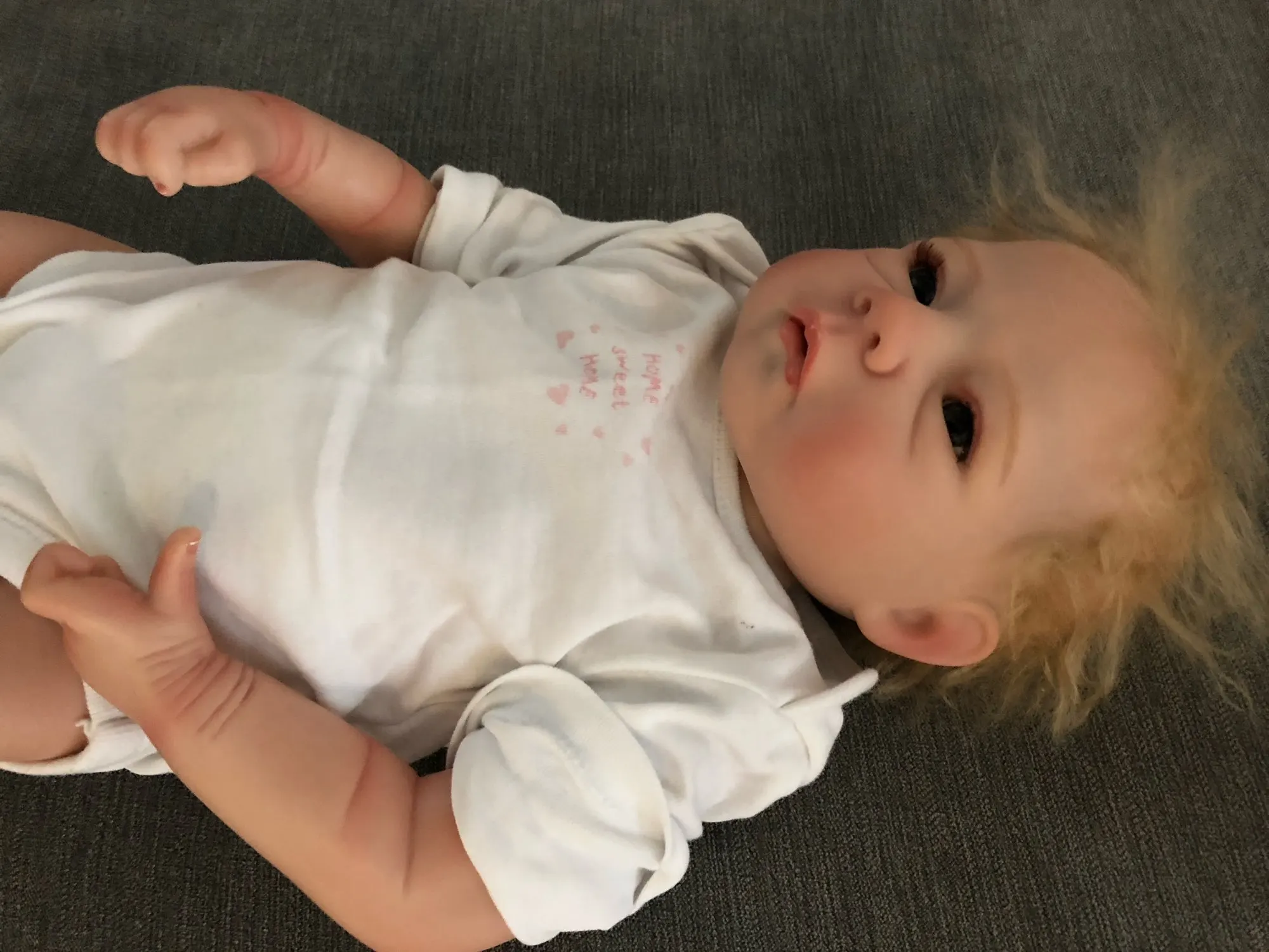 Ребенок очень очень красивый, он весит свой маленький вес, он очень гибкий и имеет больше на коже, как 1 настоящий ребенок, он милый, как ТТ, но спина плоская, как будто она была скручена, я считаю, что это немного позор, но эй, Он имя Fabrice и очень очень счастлив!
