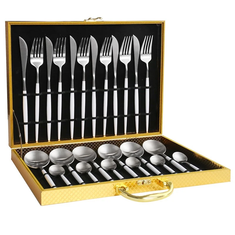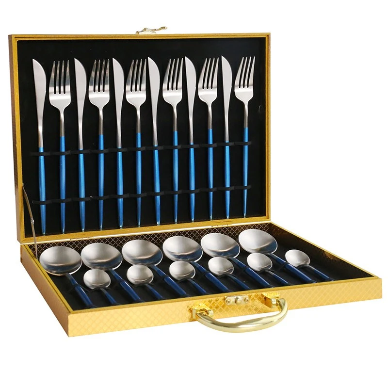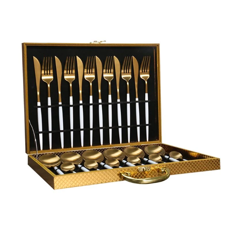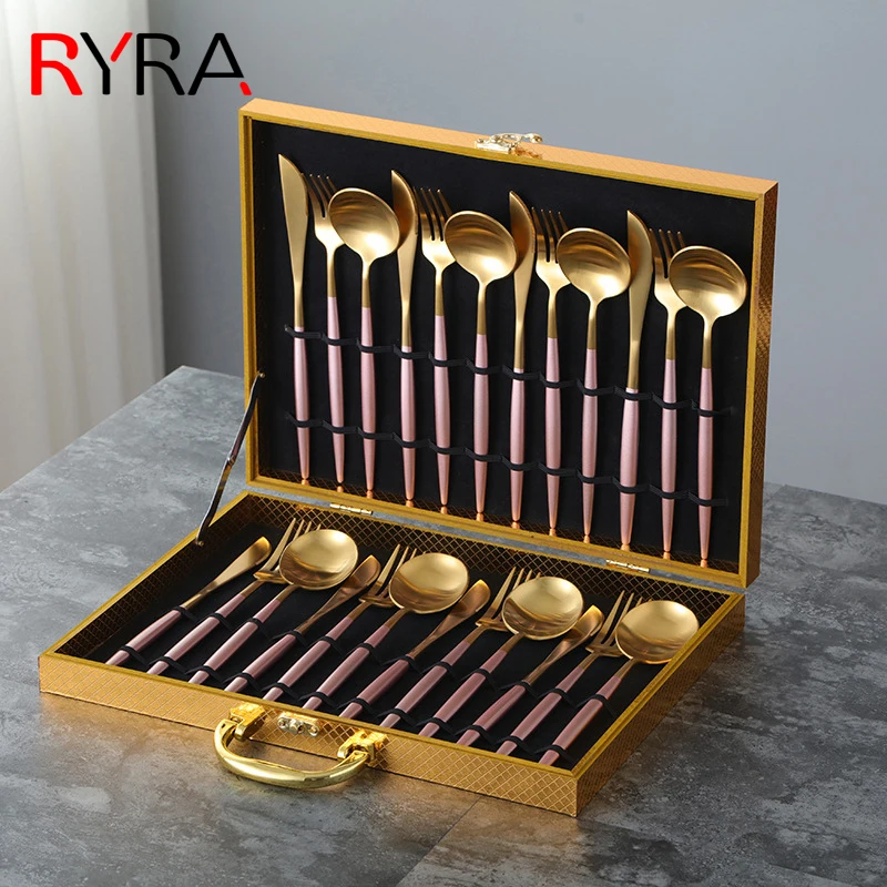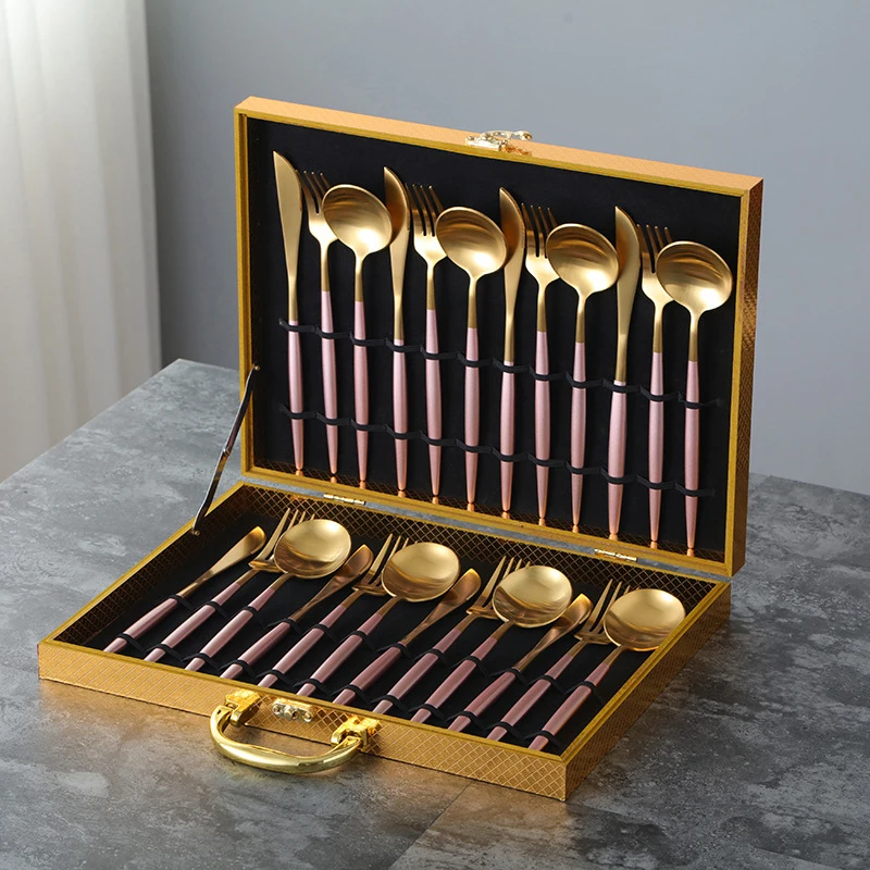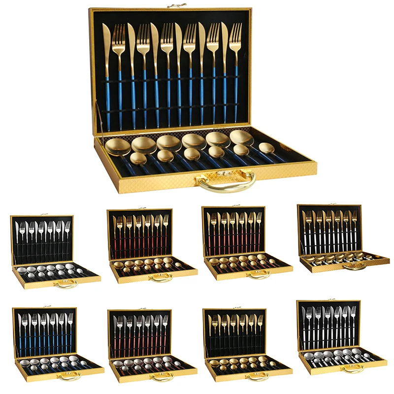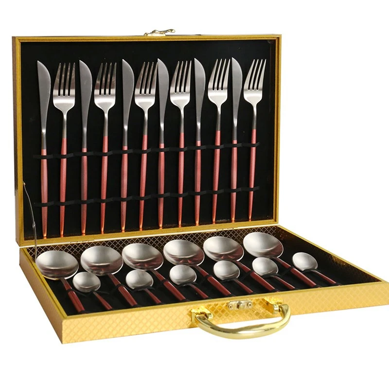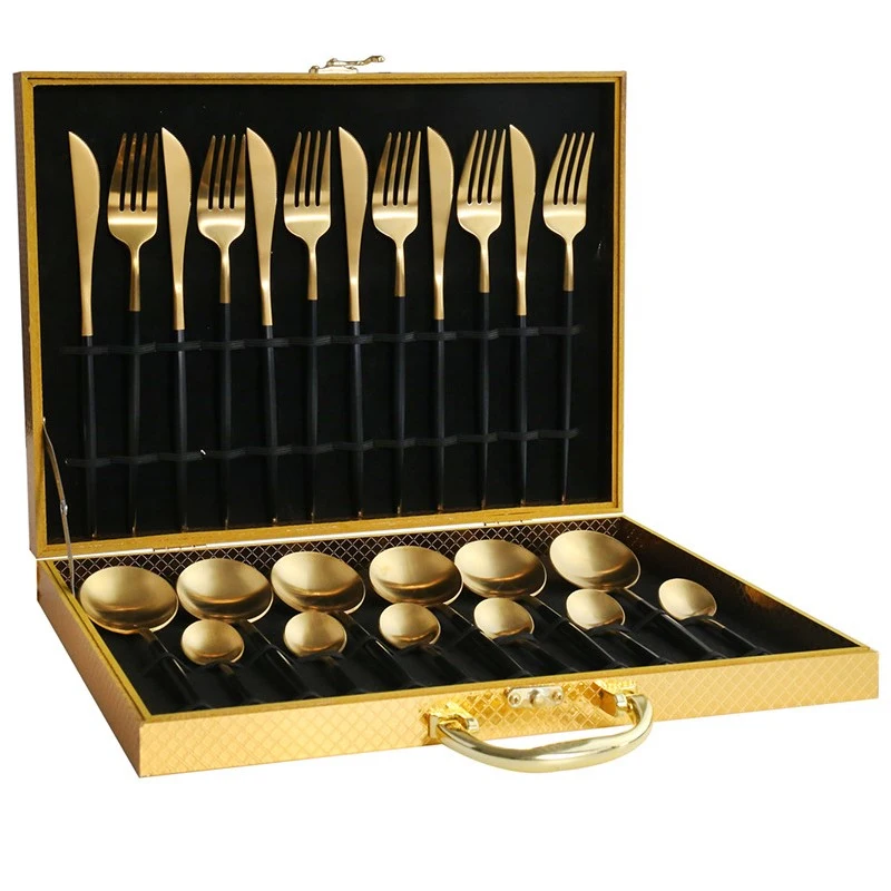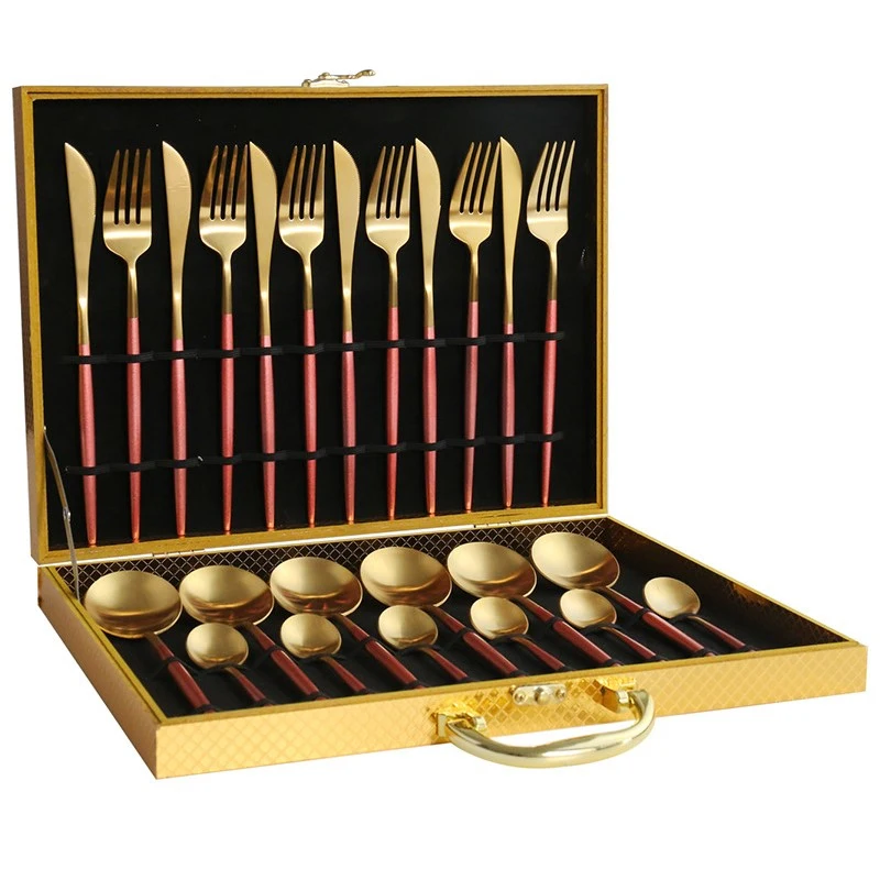 24 шт. столовые приборы в коробке, покрытый металлом нож, вилка, нож из нержавеющей стали, вилка, португальский нож, вилка, ложка, золотой кухонный набор посуды
