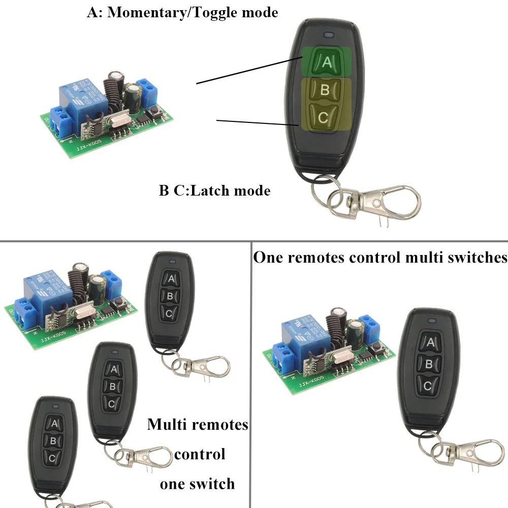 Вы можете настроить кнопку в режиме momenary, кнопку B C в режиме защелки Также Многие пульты могут управлять одним переключателем, один пульт дистанционного управления может управлять многими переключателями