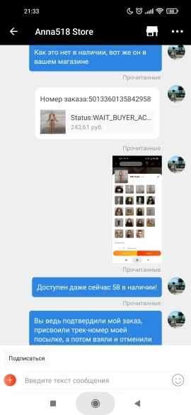 Вот уж и не знаю, как оценивать... Оплатила покупку, посылку отправили, а через пару недель узнаю, что продавец отменил заказ! На мои вопросы пишет, что товара нет в наличии, но при этом данный товар по-прежнему можно положить в корзину и оплатить. Что это означает, что это за новый вид обмана, не понимаю, но эта хрень мне не нравится.