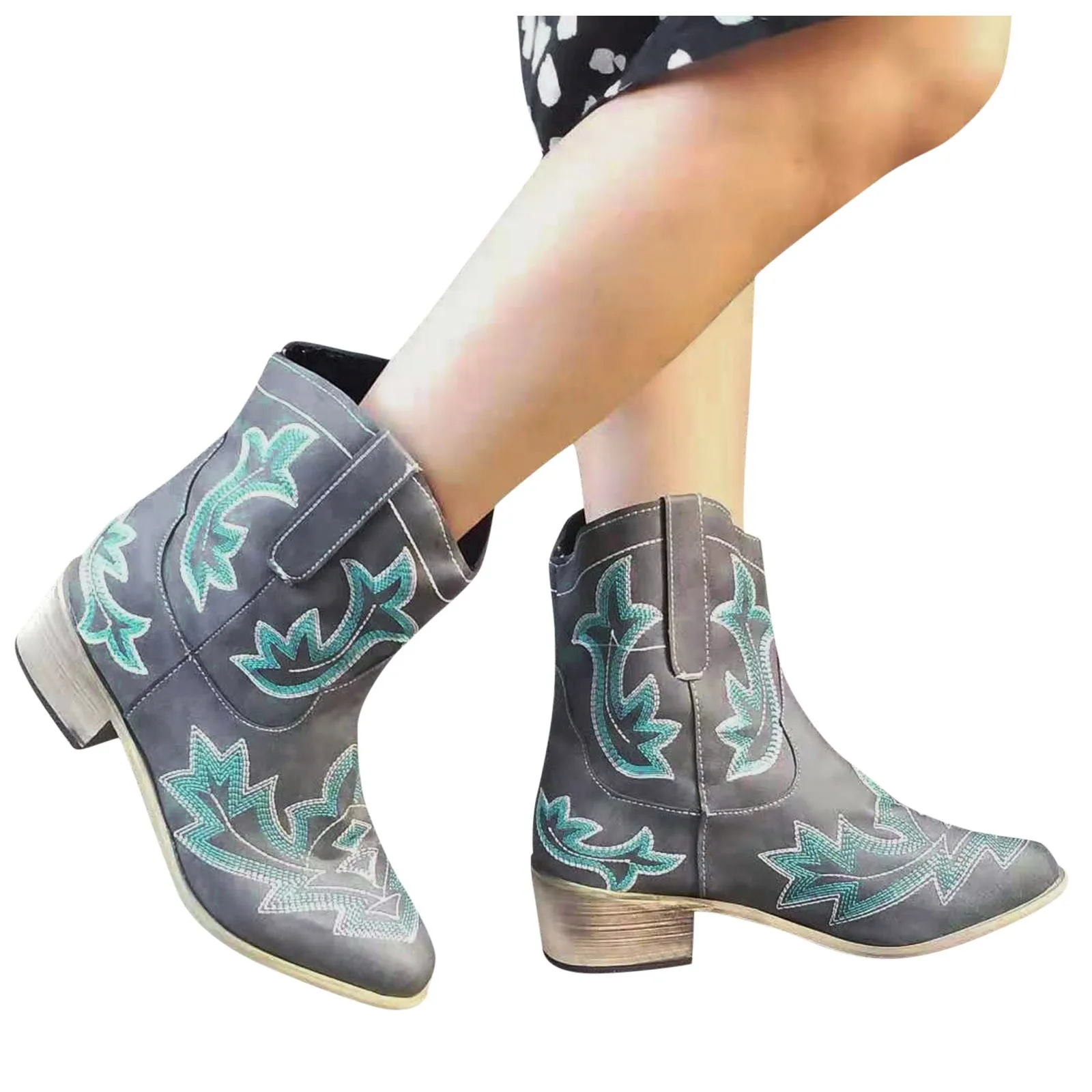 2021 ковбойские ботинки; Женские винтажные ботильоны; Модная обувь с вышивкой; Новинка 2021 года; Сезон осень; Женские ботинки из коровьей кожи на толстом каблуке с острым носком для мальчиков