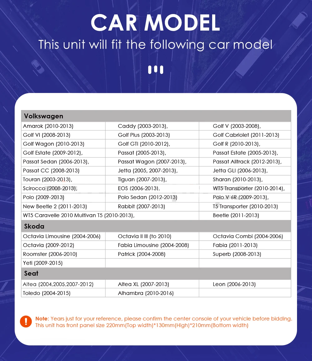 Автомобильный мультимедийный плеер с GPS костюмами Для сиденья Для Altea ab 05/2004 Для Toledo ab 12/2004 Для Leon ab 09/2005 Для Altea XL ab 04/2007Alhambra ab 2010 Для VW Для VW/SAGITAR/JATTA/JETTA Для VW/MAGOTAN V6 Для VW/PASSAT B6 Для VW/PASSAT V6 Для VW/вариант MAGOTAN Для VW/PASSAT B7 Для VW/PASSAT NMS Для VW/PASSAT Variant Для VW/PASSAT CC Для VW/PASSAT TSI Для VW/TOURAN Для VW/GOLF V Для VW/GOLF VI Для VW/GOLF VARIANT Для VW/TIGUAN GP Для VW/SHARAN Для VW/CADDY Для VW/POLO Для VW/EOS Для VW/SCIROCCO Для части VW/T5/TRANSPORTER Для VW/R36 ВАРИАНТ Для VW/BEETLE Для VW/MULTZVAN Для VW/GOLF CROSS Для VW/GOLF BLUE MOTION Для VW/SPORTLINE Для VW/BORA Для VW/AMAROK Для Skoda Для Fabia Limousine ab 02/2007 bis 2012 Для Fabia Combi ab 04/2007 bis 2012 Для Praktic ab 04/2007 bis 2012 Для Roomster ab 04/2006 bis 2012 Для Octavia Combi 06/2004 bis Facelift Для Octavia Limousine ab 06/2004 bis Facelift Для Octavia II 2 & III3 Для Yeti ab 2009 bis 2012 Для превосходного/3 t ab 2008 bis 2012