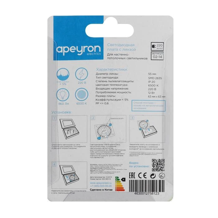 Плата светодиодная Apeyron Electrics, 12 Вт, SMD2835, 6500 К, 960 Лм/Вт, 220 В 6960079