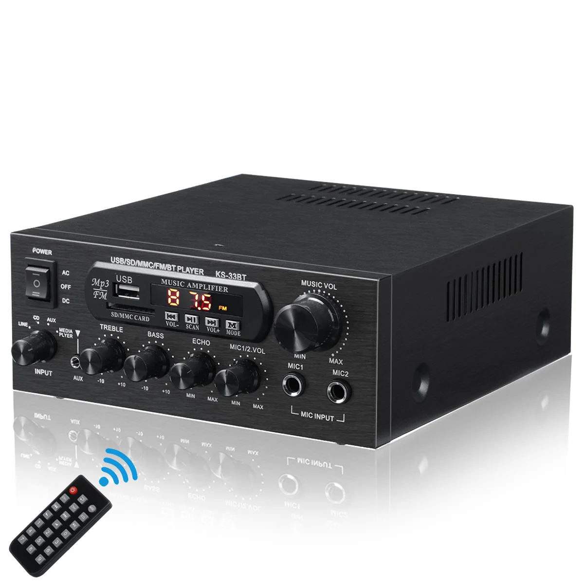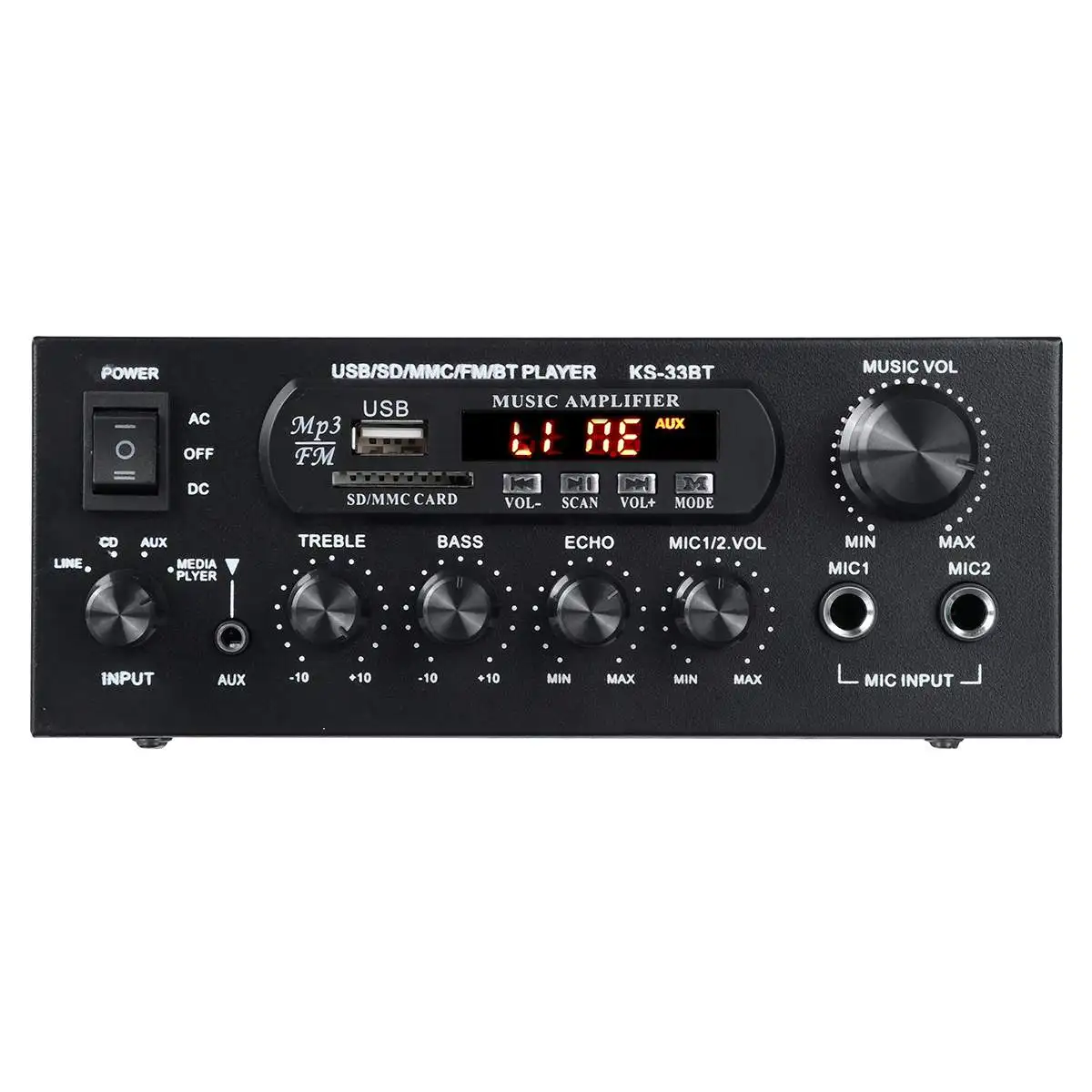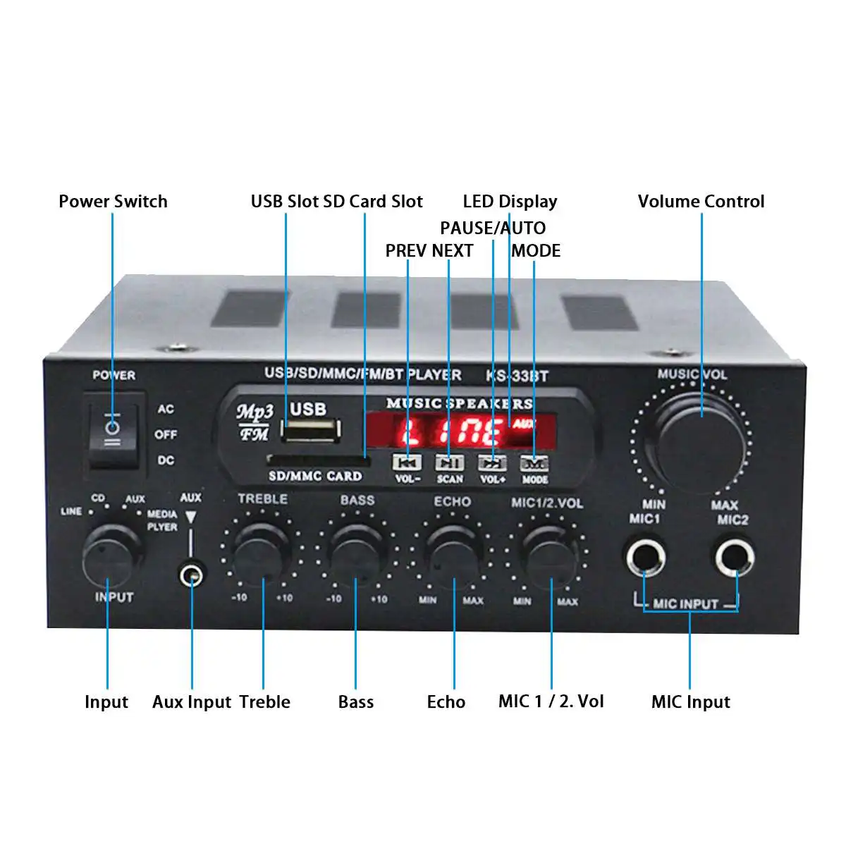 Особенности:-Цифровой mp3-плеер.-Интерфейс bluetooth для потоковой передачи музыки с мобильный телефон-Слот USB / SD для воспроизведения MP3 с карты памяти или карты-Поддерживает fm-стерео радио.-Поддержка 2 way вход для микрофона.-С высокими частотами, басами и регулятором громкости, очень прост в использовании.-Низкое Искажение обеспечивает более четкий, сильный и мощный звук.-2 канальный выход.-С функцией дистанционного управления.-Питание постоянного/переменного тока, подходит для домашнего использования.-Подходит для HiFi, систем домашнего кинотеатра и караоке