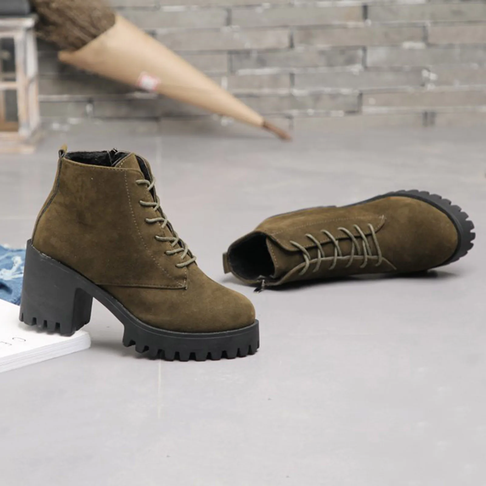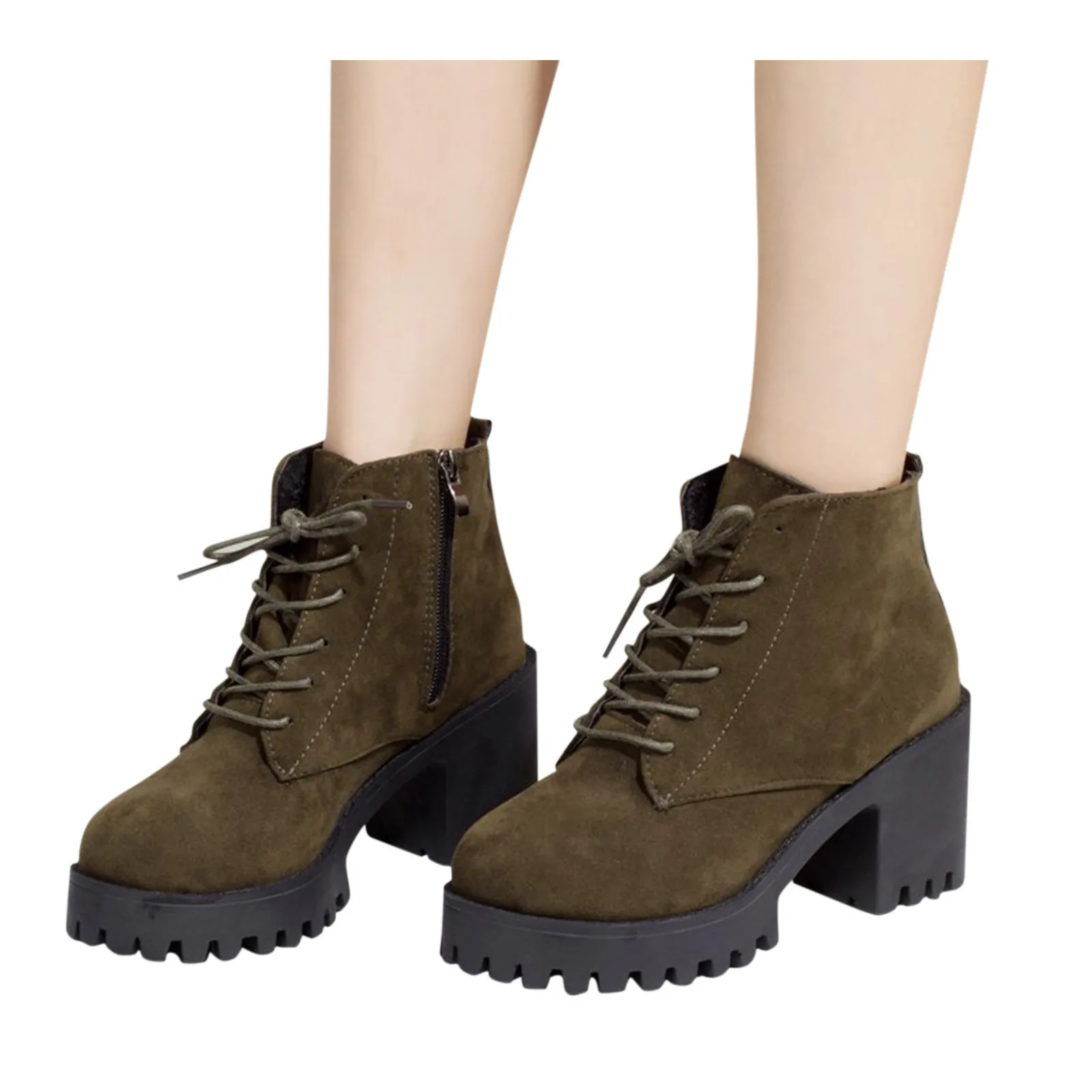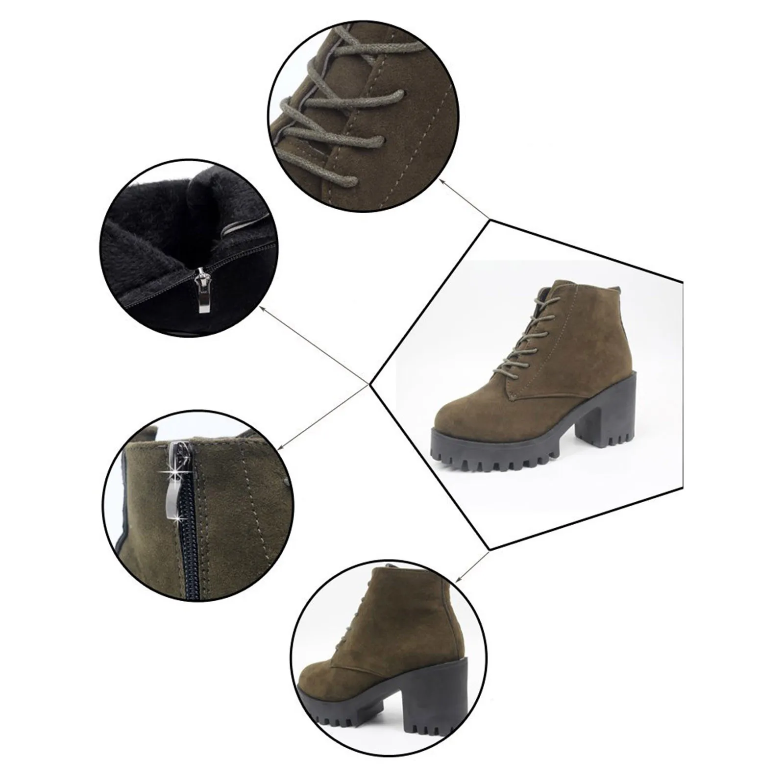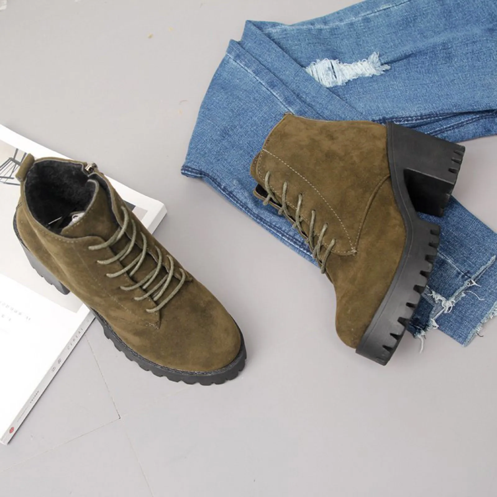 Женские ботинки; Коллекция 2021 года; Зимние ботинки для женщин; Модная обувь на квадратном каблуке; Рабочие ботинки из флока на шнуровке; Цвет армейский зеленый; Распродажа